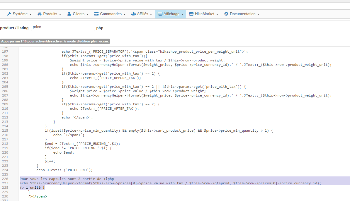 Or il faudrait pour les capsules qu'un champ s'affiche avec un contenu qui soit le: prix personnalisé /(divisé) par la quantité dans le produit.