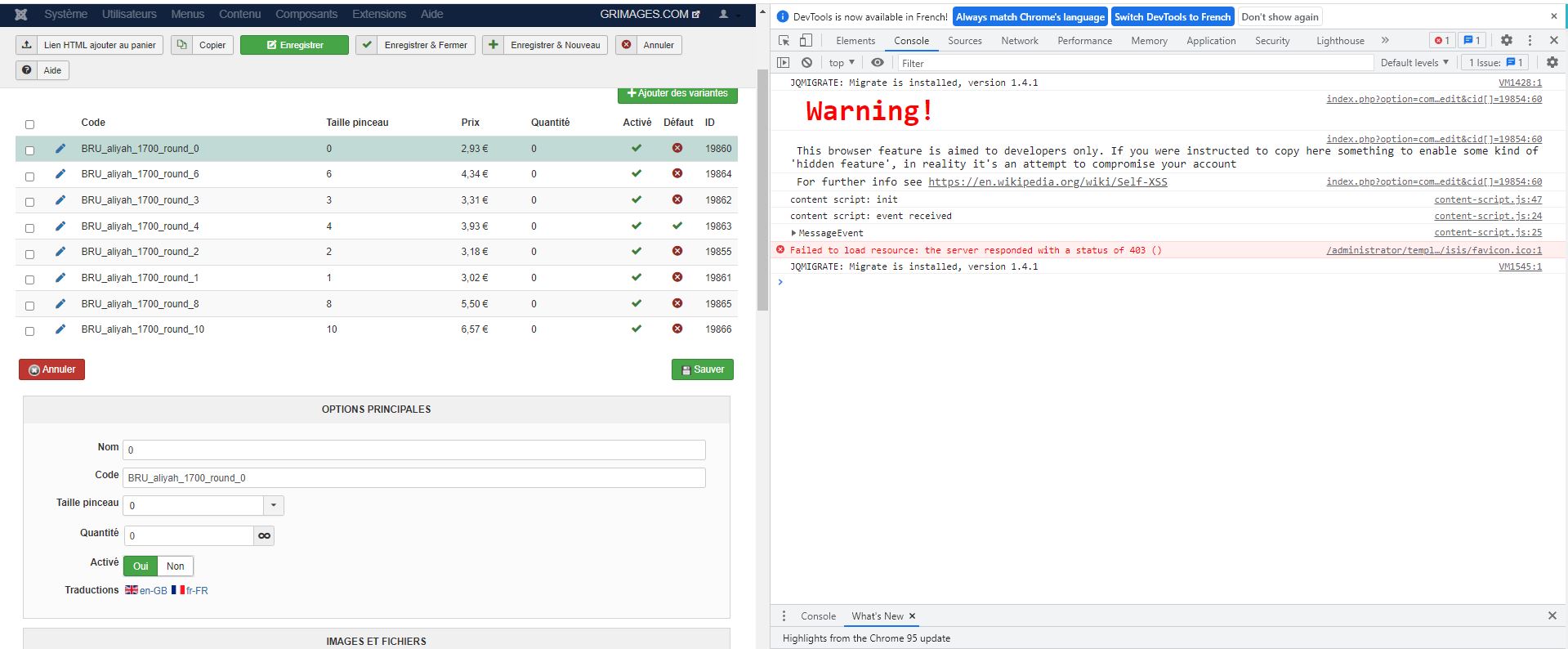 Il m'est devenu impossible de supprimer des photos de variantes de produits. Lorsque je clique sur la croix de suppression, rien ne se passe alors que tout allait bien auparavant. Si je souhaite ajouter une photo, je me retrouve avec un encart qui m'était inconnu à ce jour (voir capture). Une fois la photo choisie, je ne suis plus en mesure de revenir à l'édition de ma variante produit et je dois fermer ma fenêtre pour en ouvrir une autre...