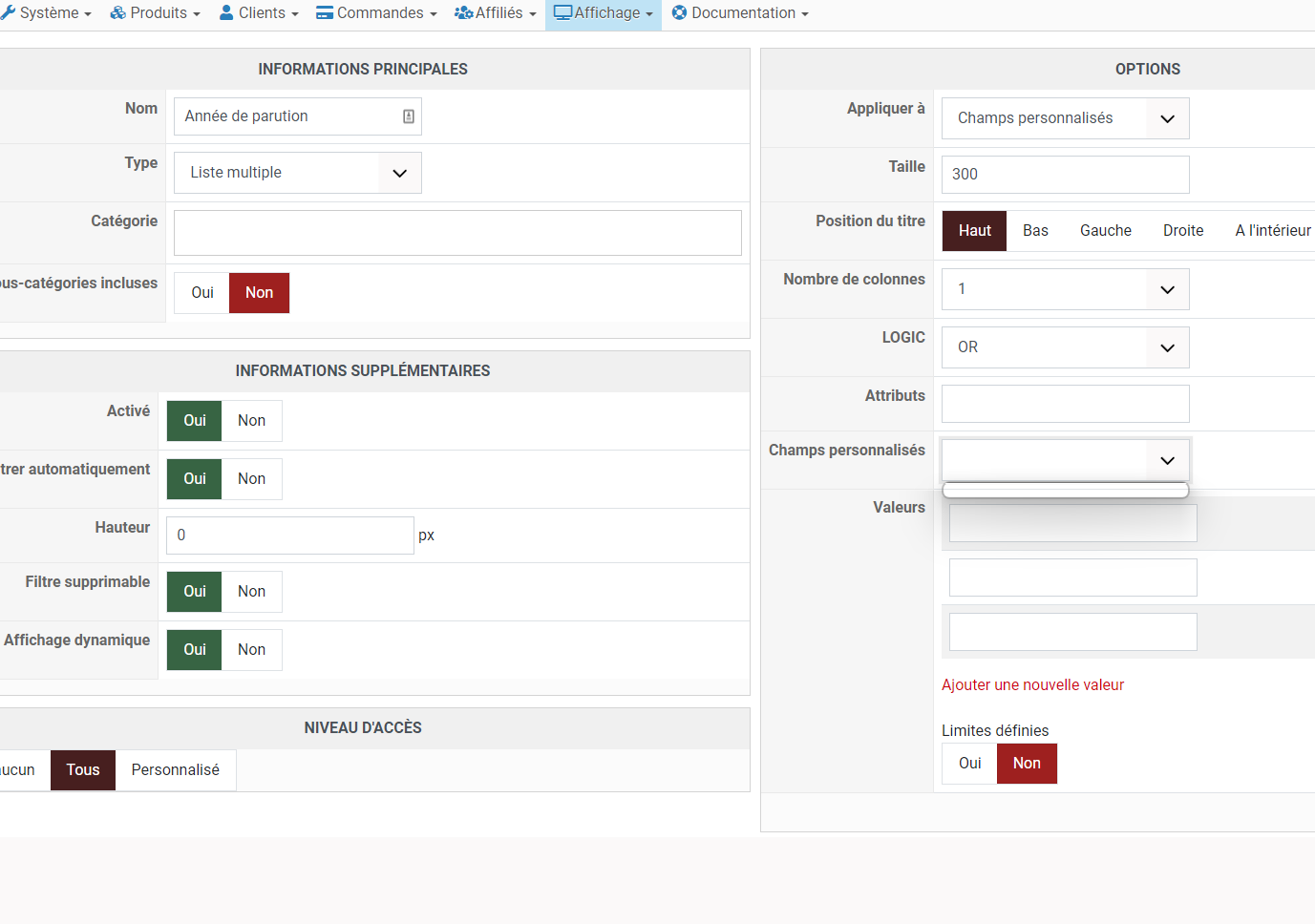 DAns le pannée de droite impossible de seclectionner le champ personnalisés crére en 1 la liste déroulante est vide ...