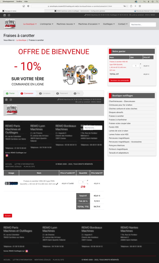 Le passage en caisse fonctionne correctement, mais lors de l’enregistrement d’un nouveau compte la page web ne s’affiche pas correctement. Les header et footer s’affichent une nouvelle fois (Voir la capture d’écran). Par contre l’email d’activation est bien envoyé au nouveau client et lors de l’activation du compte la page web s’ouvre dans une nouvelle fenêtre correctement.