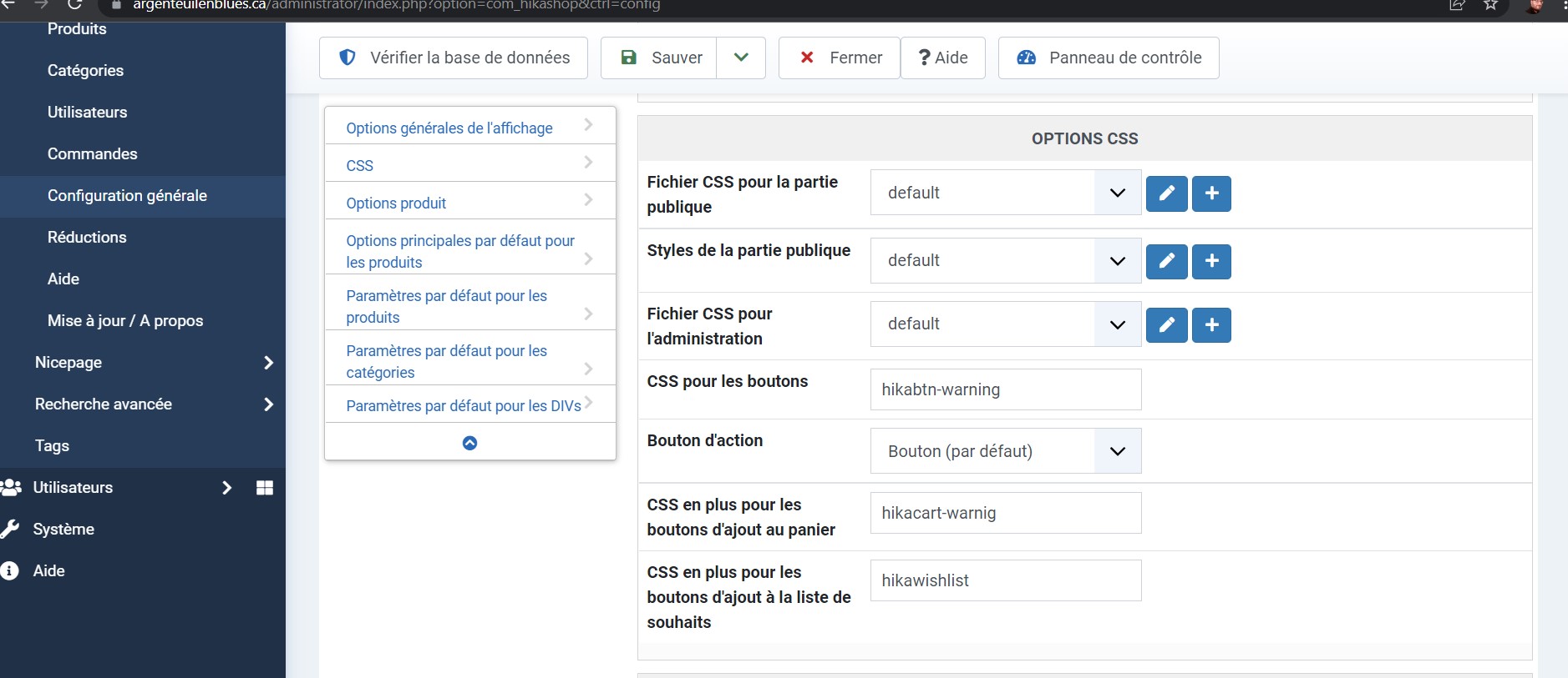 Dans la configuration HikaShop, vous avez une option "CSS pour les boutons" dans l'onglet "Affichage". Par défaut, vous avez "hikabtn" dans cette option qui correspond à la classe des boutons dans HikaShop. En dessous de cette option, vous avez également l'option "CSS en plus pour les boutons d'ajout au panier" avec la valeur "hikacart" qui correspond à la classe des boutons d'ajout au panier dans HikaShop.