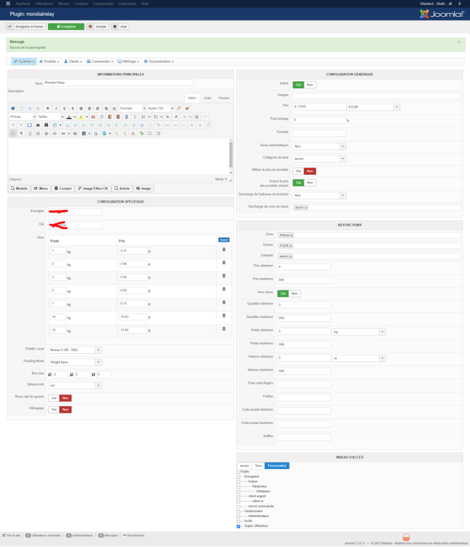 La configuration de prix du plugin Mondial Relay se base sur les tranches de poids.