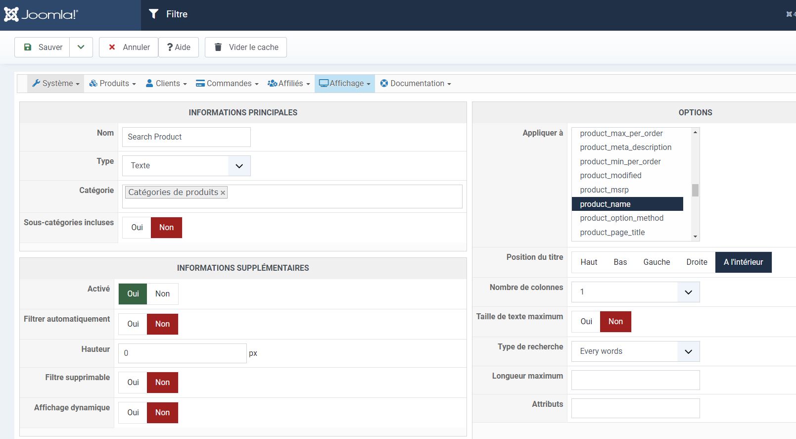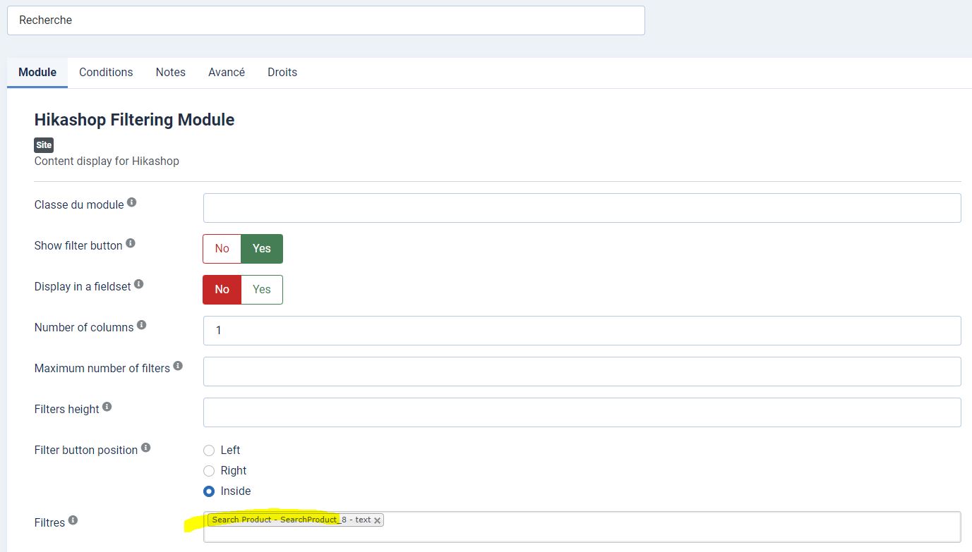 De ce fait, la seule solution que j'ai trouvée serait de doubler dans le menu Affichage / Filtres ce champ de recherche et de créer un mod_hikashop_filter par langue qui appellera le bon champ de recherche dans la langue correspondante.