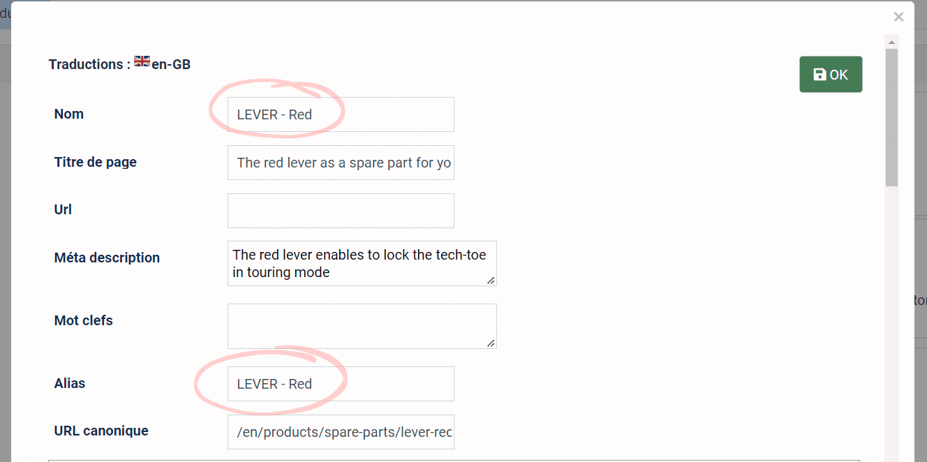 Lorsque vous avez le texte "TOTO ROUGE" dans le nom du produit (colonne product_name du CSV), le système va sauvegarder les traductions du nom avec la clé TOTO_ROUGE. Et si vous avez l'alias du produit avec "toto-rouge" (colonne product_alias dans le CSV), alors la clé de traduction sera aussi TOTO_ROUGE pour les traductions de l'alias. Et c'est là que vous avez un conflit.