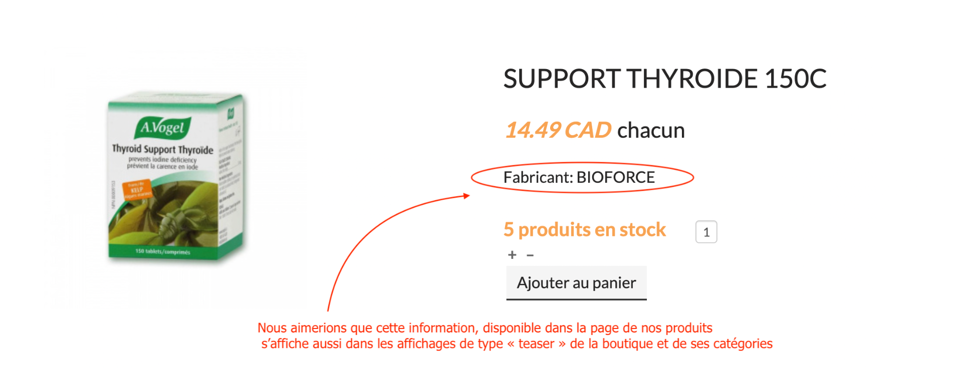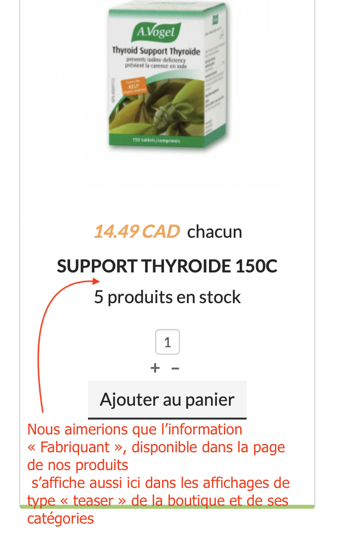 Nous souhaitons ajouter la vue de l'information "Fabriquant" dans le "teaser" de chaque produits lorsque nous nous trouvons dans la page de la boutique ou des catégories...