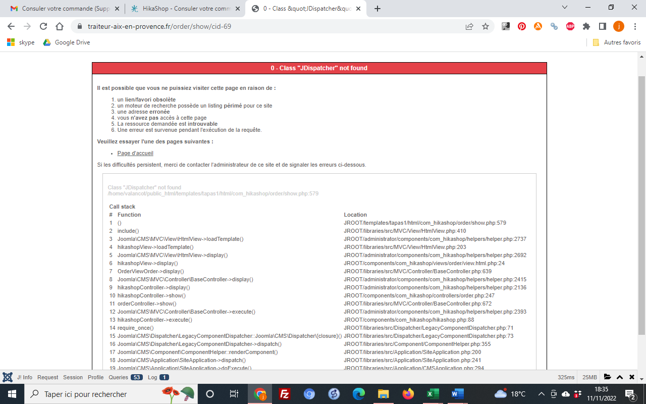 Voici le message d'erreur lorsque je click sur consulter ma commande ici