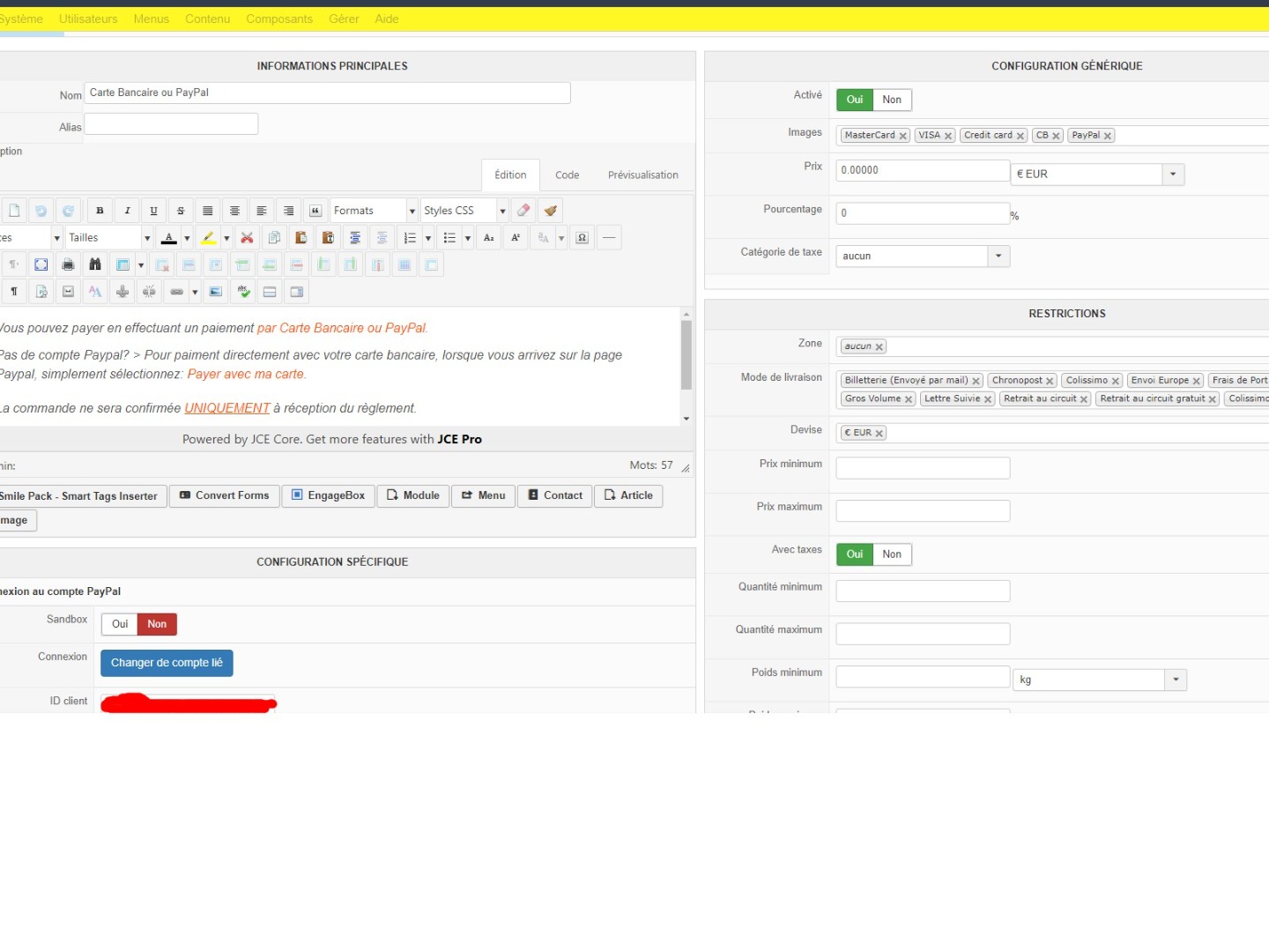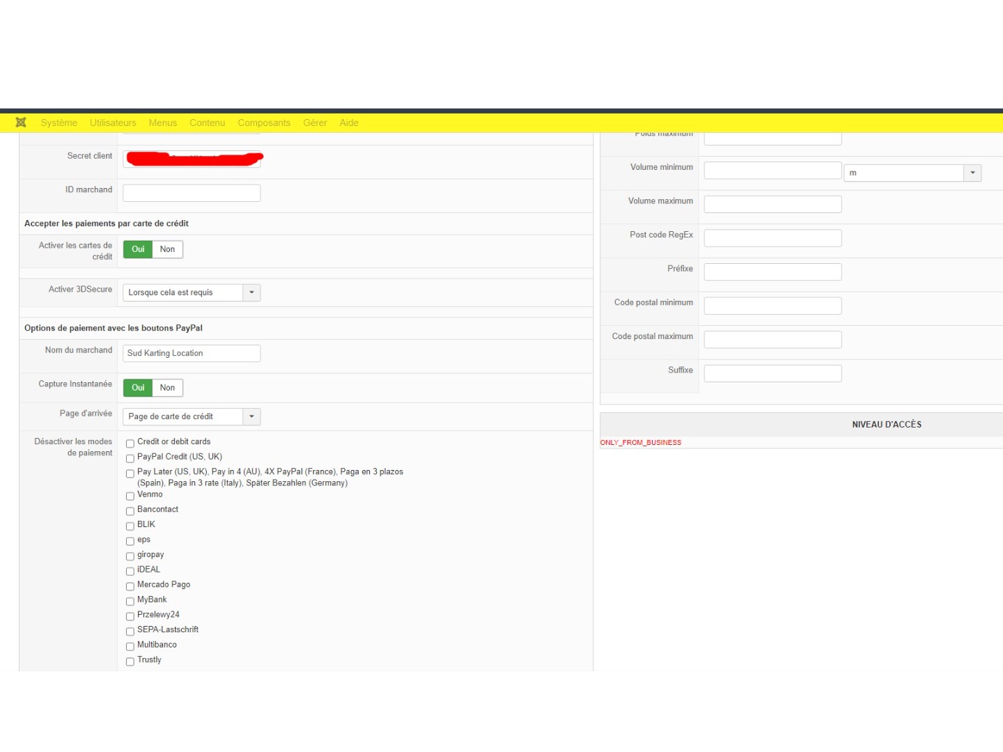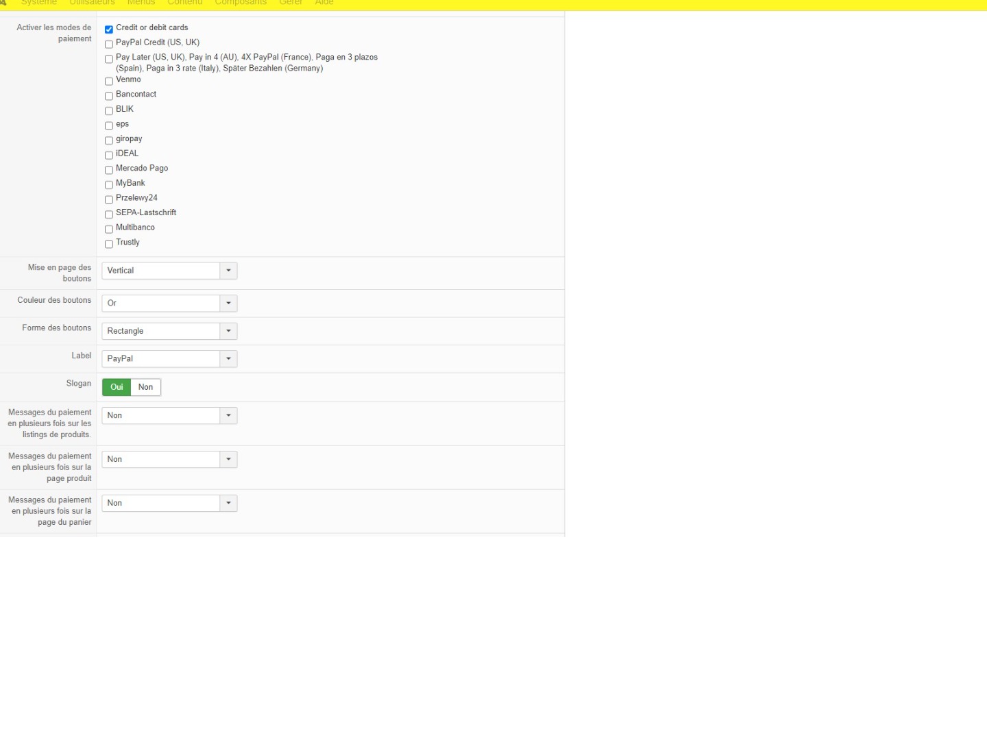Donc si vous ne savez pas et vous ne voulait pas prendre le temps de voir de votre coté comment ces règles CSP sont ajoutées sur votre site, le plus simple c'est de désactiver l'option "enable credit cards" de votre méthode de paiement. Vous retrouverez ainsi un fonctionnement similaire à ce que vous aviez auparavant, mais comme je disais, dans ce cas, le formulaire de carte de crédit de PayPal n'est pas modifiable.