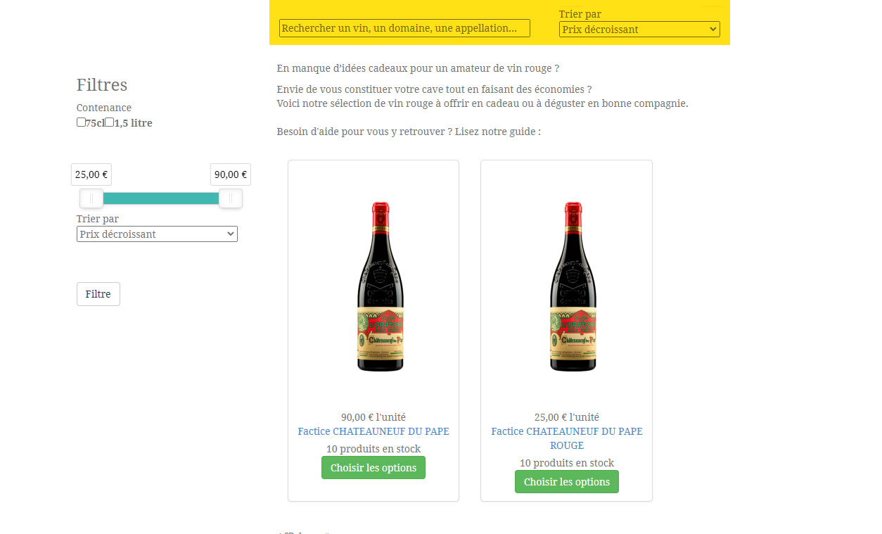 Mais voilà le cœur de mon soucie, j'aimerai aussi avoir des filtres avant les produits (uniquement ce de filtrage de prix et recherche par nom)(voir capture zone jaune)