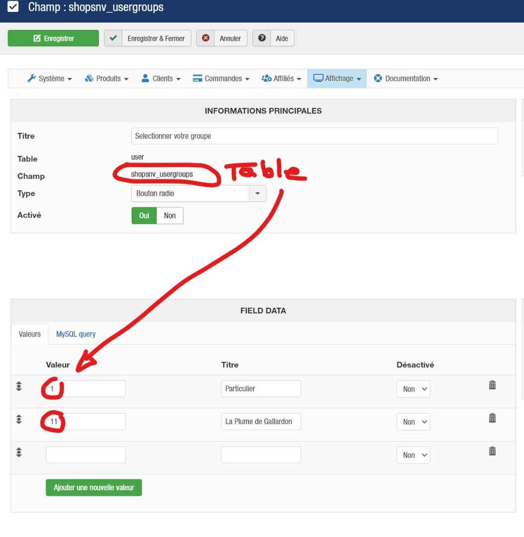 J'ai créé mon champs personnalisé, sélectionné "user", le champs dans ma table "shopsnv_usergroups"
