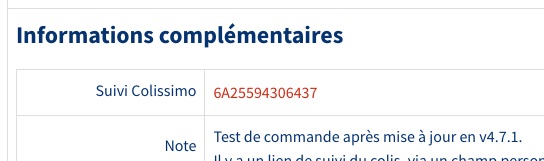 Il y a des liens de suivi des colis, via un champ personnalisé de type "order" nommé "Suivi Colissimo", mais ils ne s'affichent pas en frontend lorsque l'on utilise la restriction par mode de livraison ciblant les livraisons par Colissimo. Et il y a des liens de suivi des colis, via un champ personnalisé de type "order" nommé "Suivi Mondial Relay", mais ils ne s'affichent pas en frontend lorsque l'on utilise la restriction par mode de livraison ciblant les livraisons par Mondial Relay. En revanche, cela fonctionne dans le backend et pour les emails. Ça me donne l'impression qu'il manque du code côté frontend pour gérer correctement les restrictions par mode de livraison.