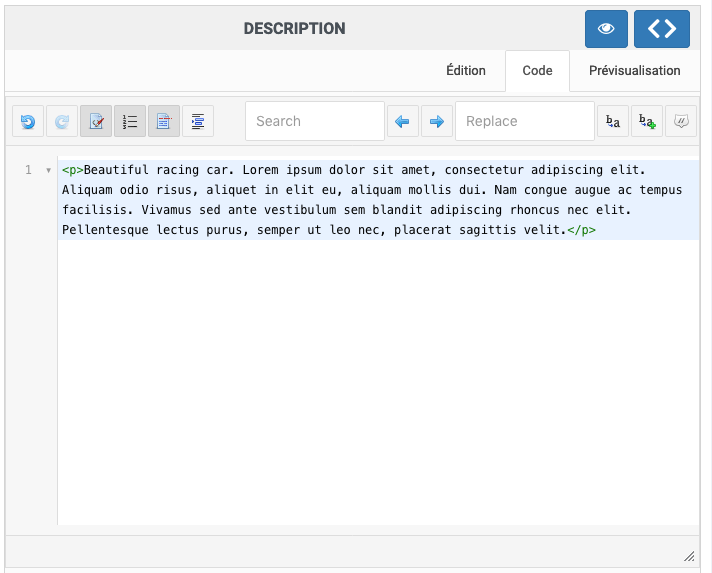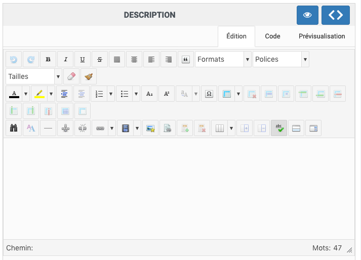 Dans le pavé "Description" de la fiche produit, impossible d'écrire quoi que se soit et ce qui est déjà écrit n'est plus visible sauf en passant en mode éditeur (voir captures).