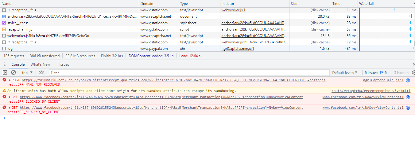 Après la connexion, pas de modif sur console sur back-end mais sur la page paypal : Failed to load resource: net::ERR_BLOCKED_BY_CLIENT