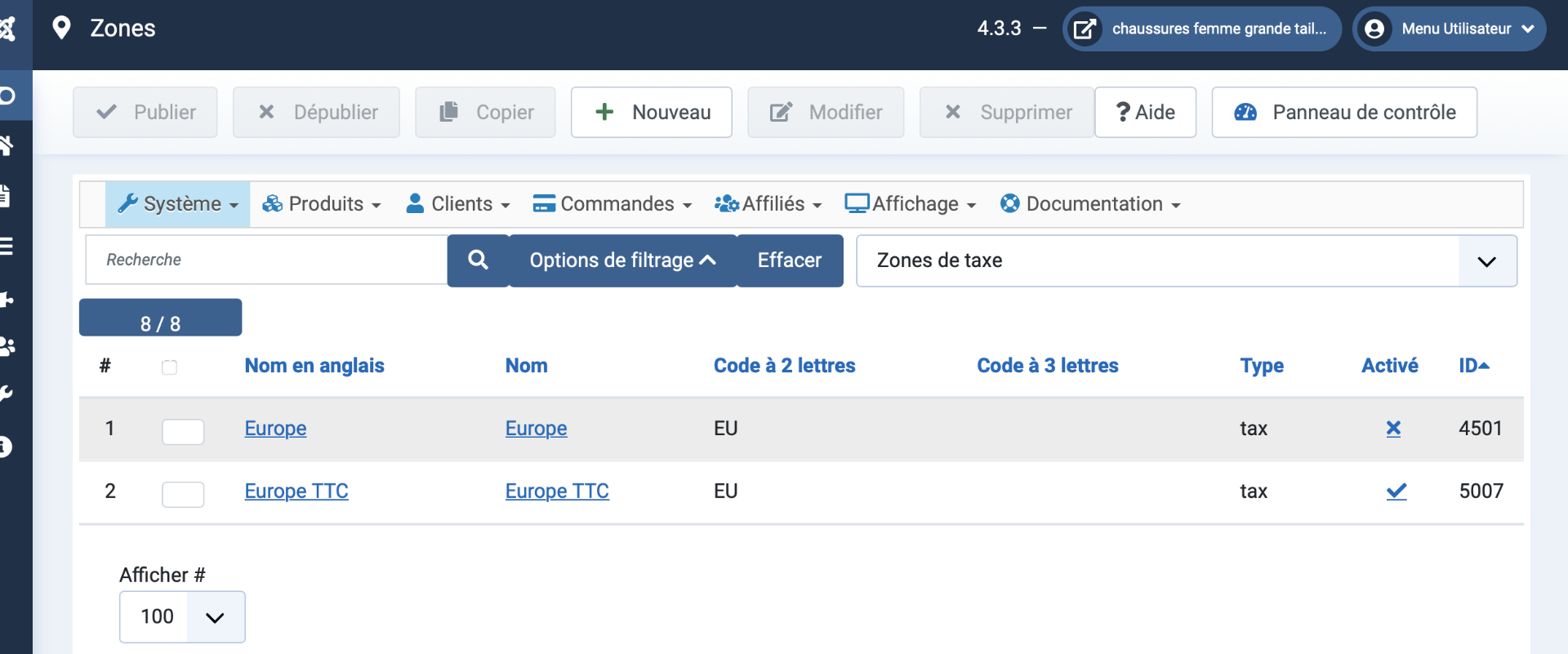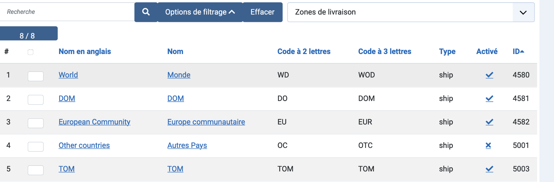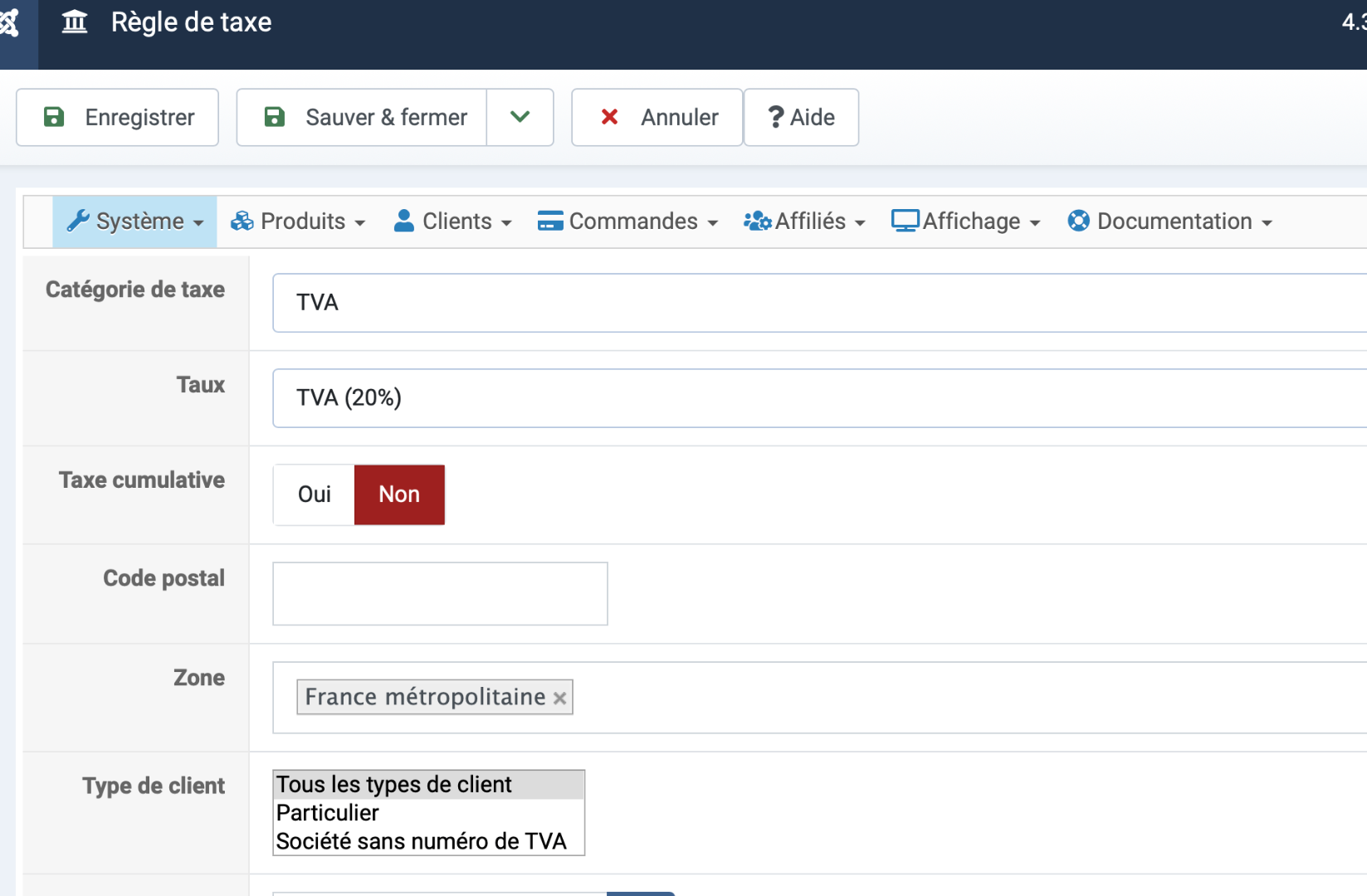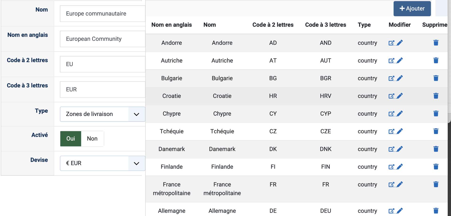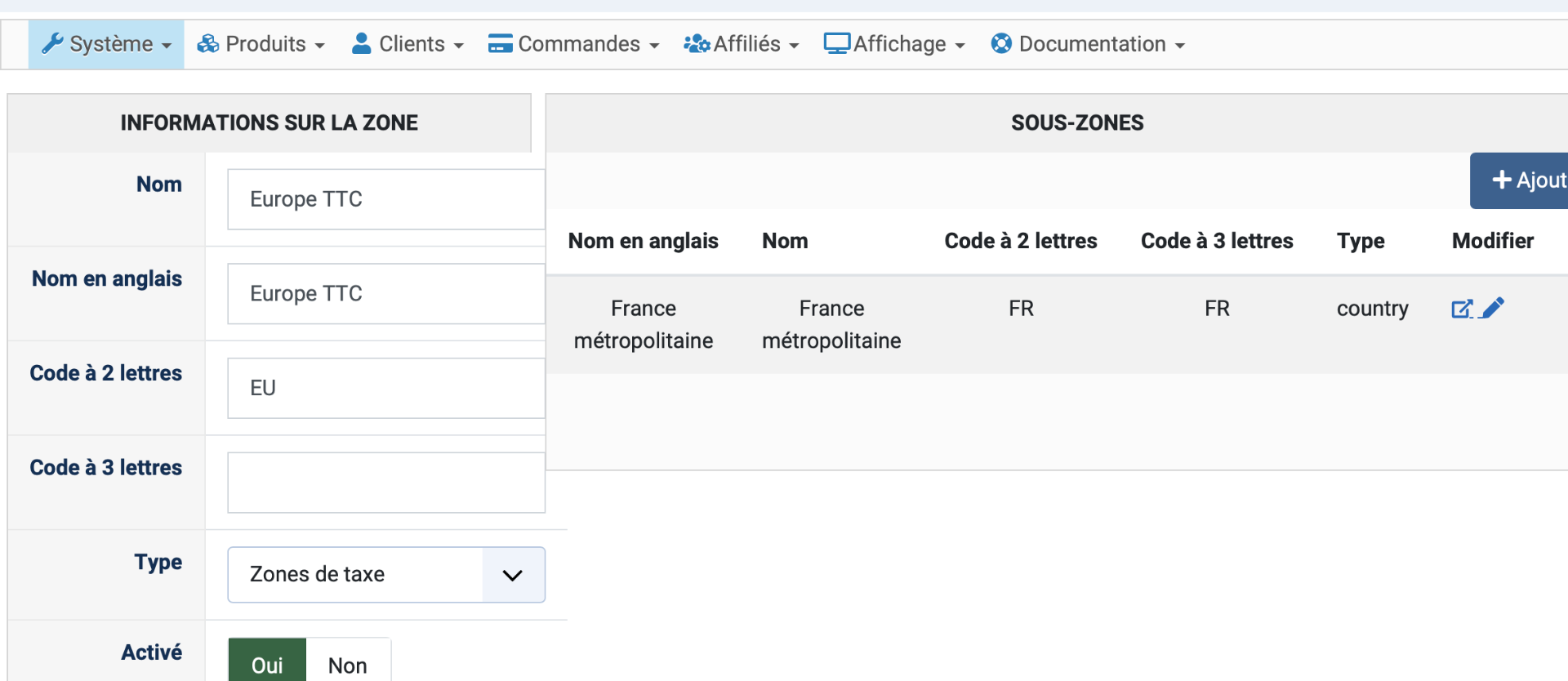 Notez que dans HikaShop, il y a déjà une zone "France métropolitaine", et une zone "France". C'est la zone France qui a le code 3 lettres FRA et le code 2 lettres FR, et la zone France métropolitaine avec FRX. Dans vos captures, la zone France métropolitaine que vous utilisez ne correspond à aucune des deux. Donc il est possible que vous ayez plusieurs zones dénommées "France métropolitaine" de configurées, et peut être que vous avez confondu l'une avec l'autre ?