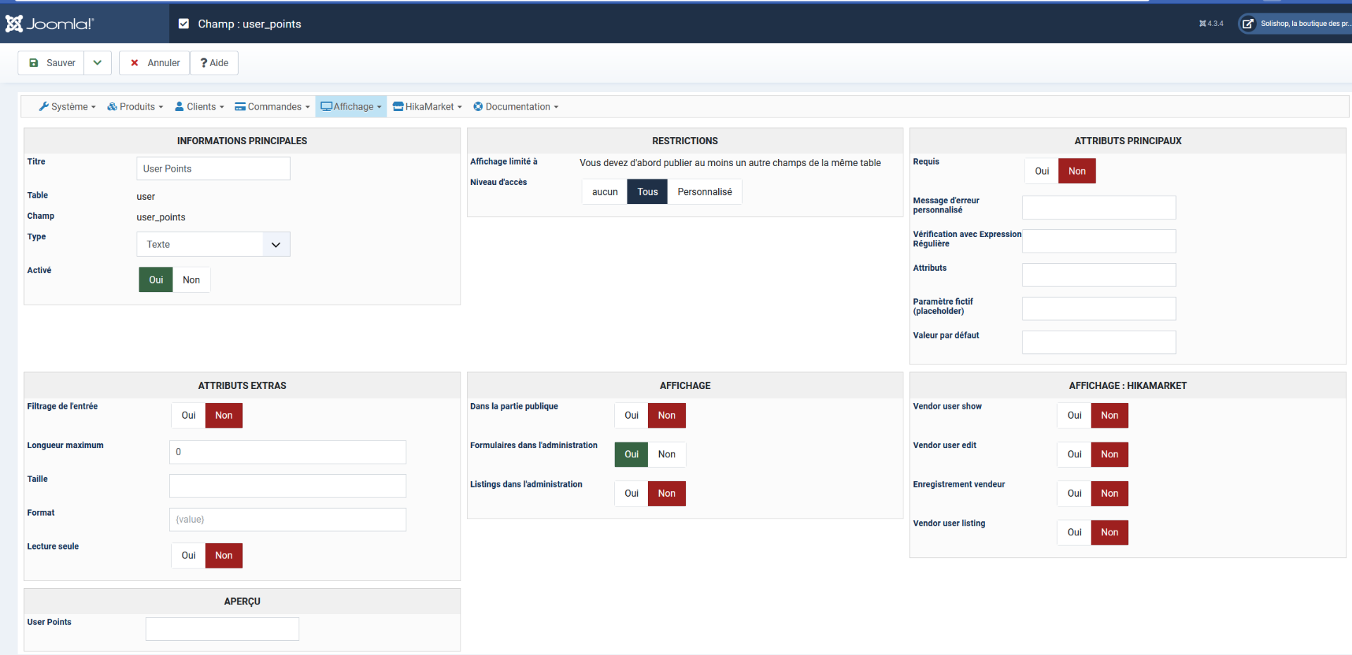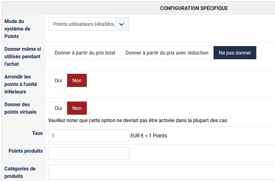 - Le plugin HikaShop User Points qui permet de donner des points aux clients lorsqu'ils achètent quelque chose, et que vous pouvez configurer dans le menu Système>Plugins