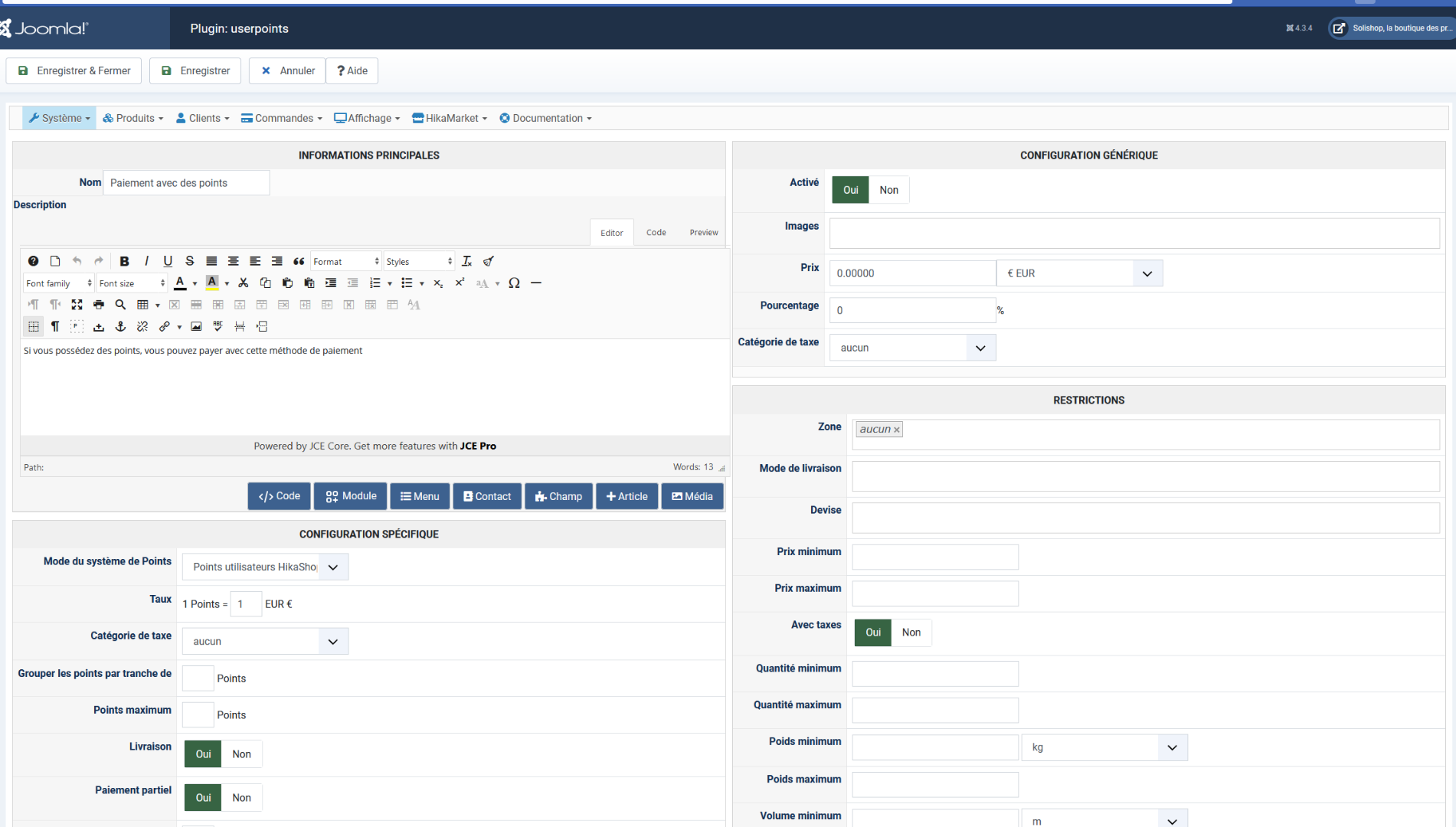 - Le plugin HikaShop User Points payment qui permet aux clients d'utiliser leurs points lors de leurs achats, et que vous pouvez configurer dans le menu Système>Méthodes de paiement