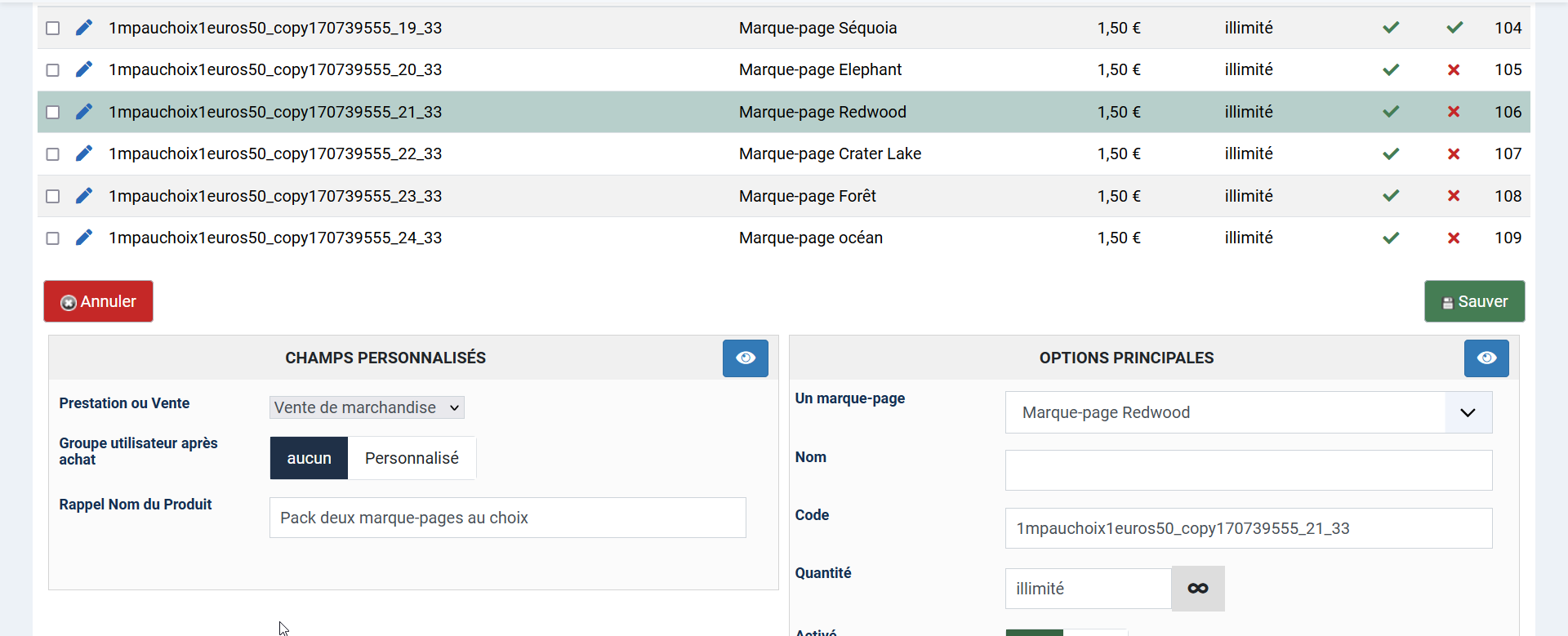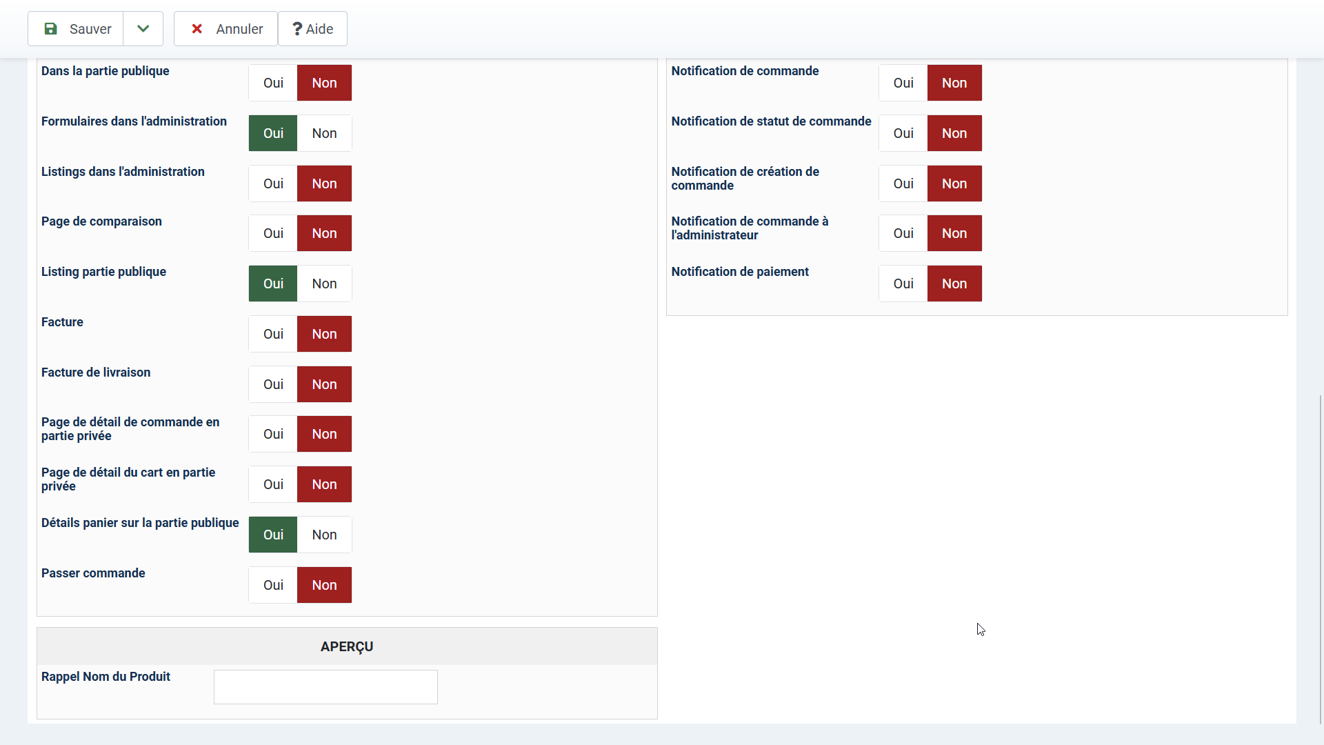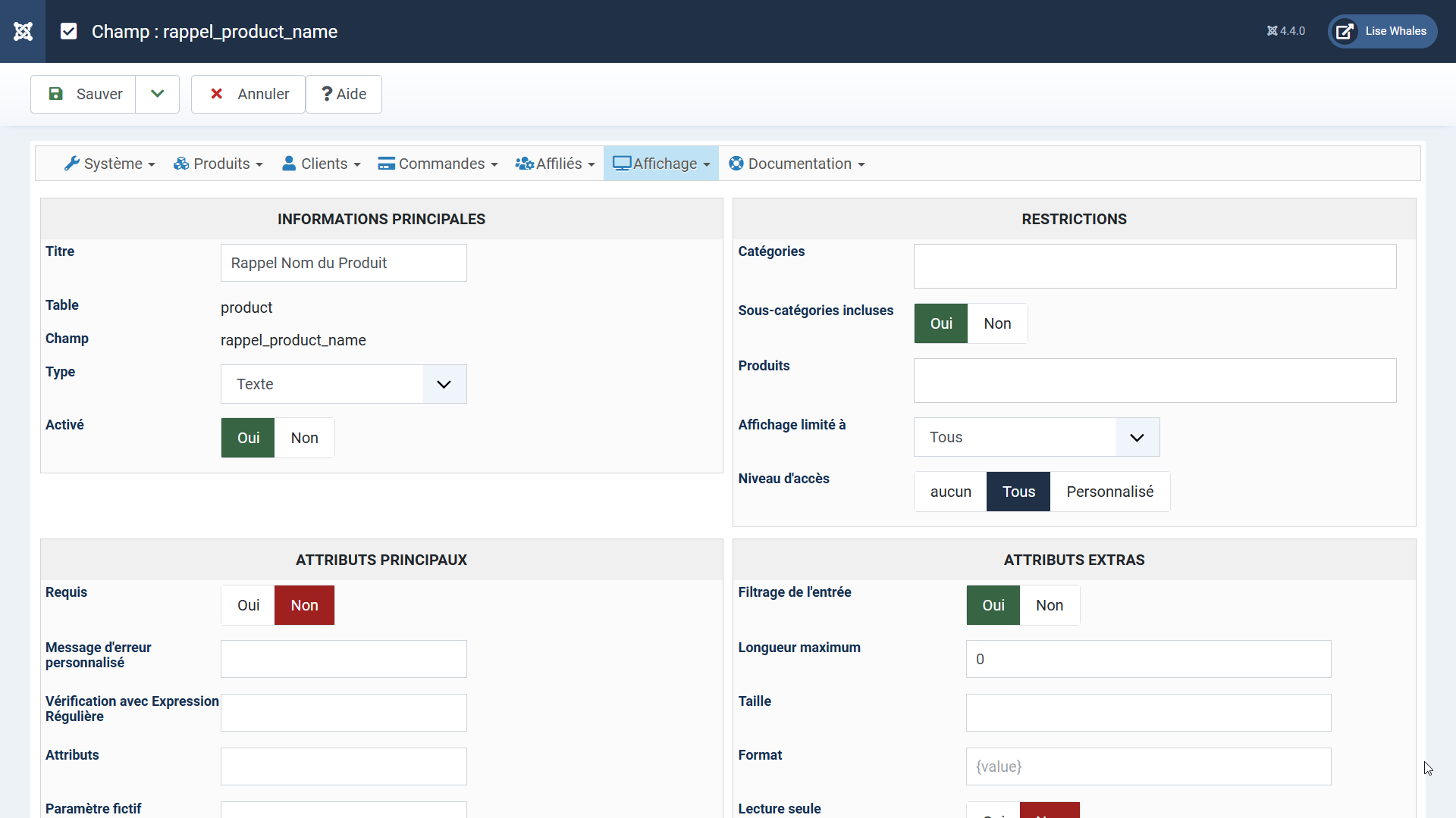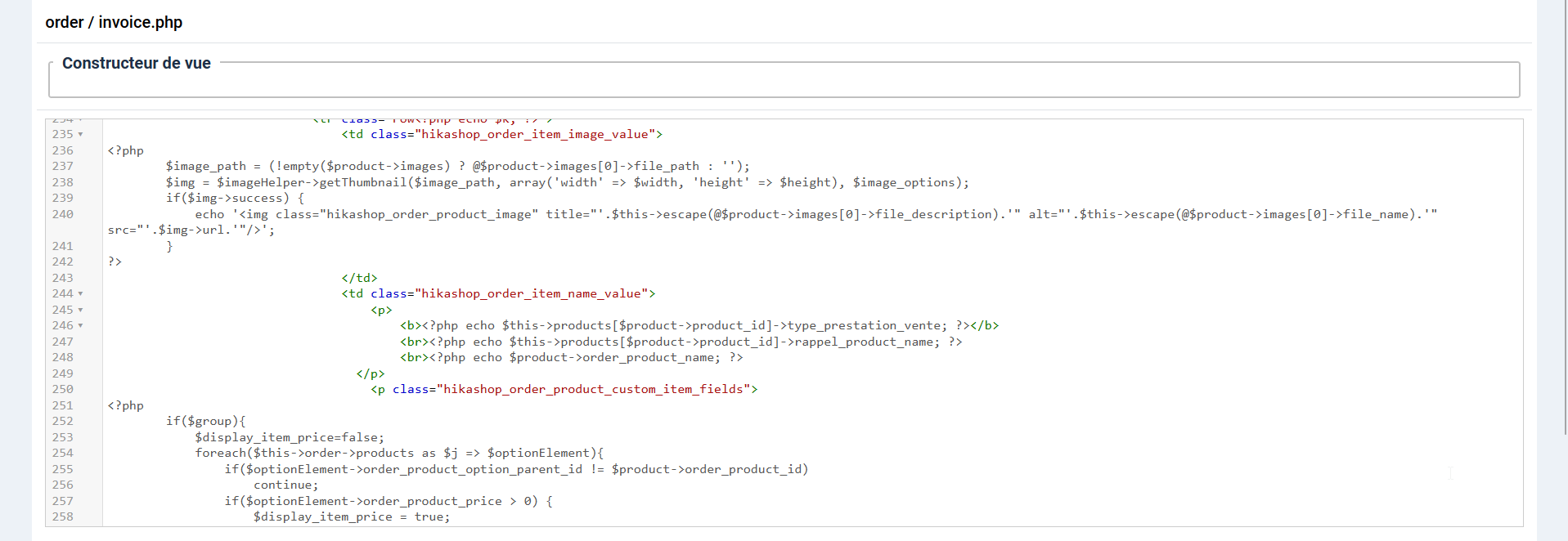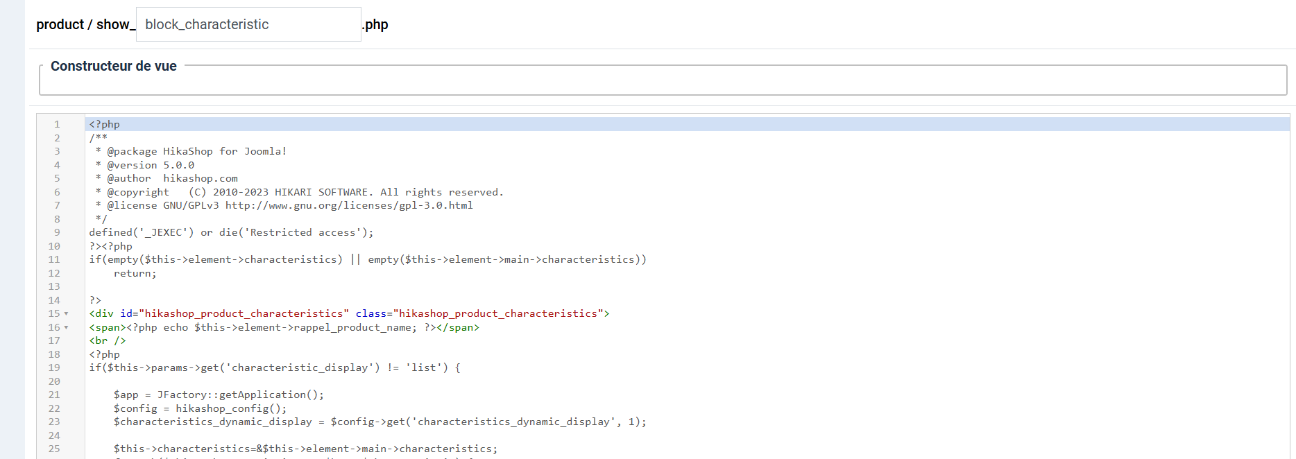De plus, le code permettant l'affichage d'un champ personnalisé n'est pas nécessairement le même d'une vue à l'autre car différents nom de variables sont utilisées dans différents contextes pour les mêmes données (par exemple, sur la page de détail d'un produit, $this->element contient les données du produit en question, alors que sur un listing de produit, $this->element contient les données de la catégorie principale du listing, et les données des produits du listing sont dans $this->rows, avec $this->row contenant les données du produit en cours d'affichage).