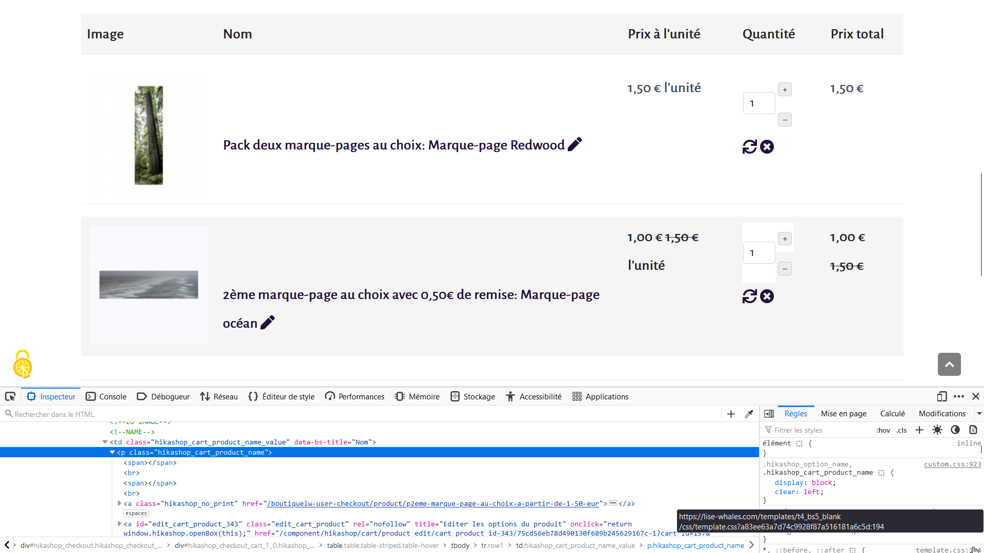 Je pense qu'il serait plus cohérent d'activer l'option "group options with product" dans la configuration HikaShop. Cela ferait que les deux choix de marque page serait pour un seul produit dans le panier et la commande, rendant les modifications que vous voulez faire inutile à la compréhension de la situation pour le client.