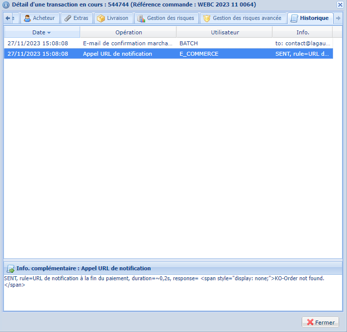 - le site ne récupère jamais l'info de la banque comme quoi le paiement est passé. Les commandes restent au statut "Créé" et je vous ai mis une capture de la réponse sur l'URL de notification ("response= " OU "response= <span style="display: none;">KO-Order not found" selon les cas) qui semble confirmer qu'il n'y a pas de réponse ou que l'info relative au n° de commande n'est pas transmise