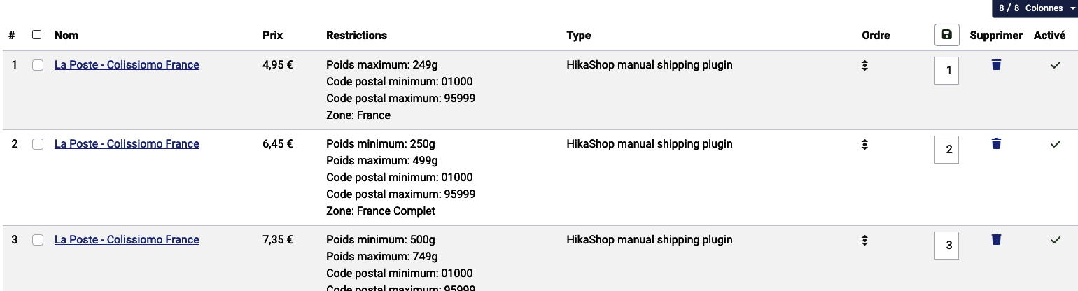 Mes expéditions se font exclusivement par la poste (colissimo). J'ai donc paramétré mes tarifs en fonction du poids.