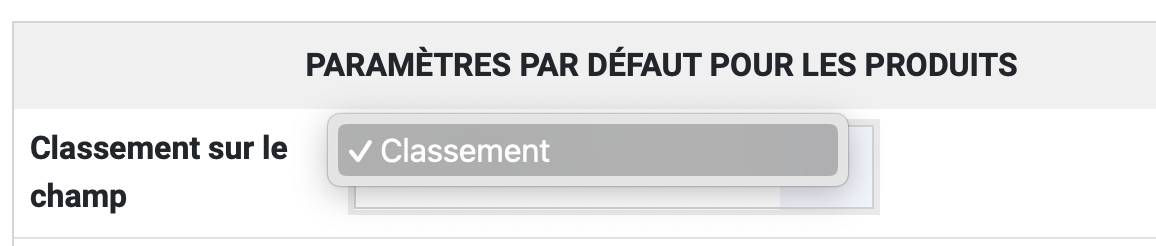 je viens de refaire une installation propre en local, dernière version hikashop, et si je vais dans la config > affichage > param par défaut pour les produits > classement sur le champ >. j'ai uniquement classement et aucune liste déroulante pour choisir le champ ni aucune erreur js sur la page