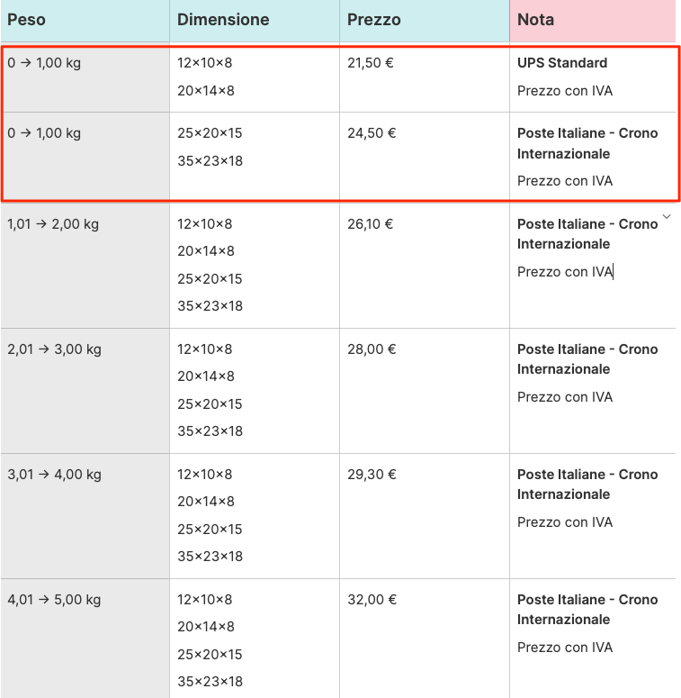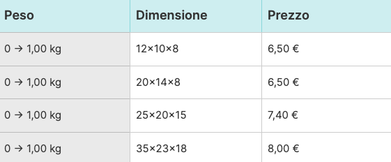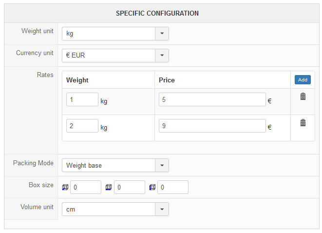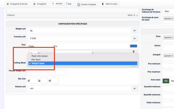 Dedans, vous utiliser le mode "pack into boxes". Et vous allez créer une méthode de livraison weight pour chaque ligne de frais de livraison que vous voulez prendre en charge (sauf si plusieurs ont le même dimensione mais différentes tranche de poids. Dans ce cas vous pouvez en faire une méthode pour toutes les lignes avec le même dimensione, et mettre votre tranche de poids dedans). Dans chacune, vous allez renseigner le dimensione dans l'option "box size", et le volume calculé à partir de cela dans "maximum volume". Et vous pourrez utiliser le min/max weight aussi. Enfin, en activant le "shipping price per product", si vous avez des produits dont l'une des dimensions empêche qu'il rentre dans le colis malgré un volume peu élevé, vous pouvez bloquer la méthode de livraison dans le produit.