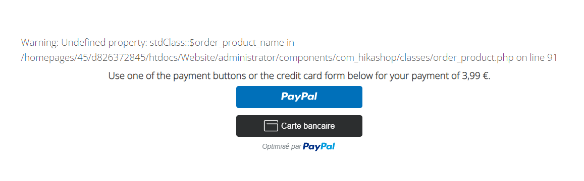 Vous pouvez ignorer l'erreur pour HikaShop. Cependant, si vous avez vraiment un produit sans nom dans la commande, il est fort probable que cela pose un souci à PayPal, si l'option "send order details" est activée dans la méthode de paiement. Donc vous pourriez essayer de désactiver l'option dans la méthode de paiement, pour voir si cela aide à éviter le problème.