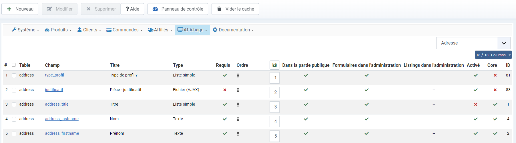Quand c'est un champ lié à la table address je ne peux pas cocher la case "Listing dans l'administration" alors qu'on peut le faire avec la table user et order.