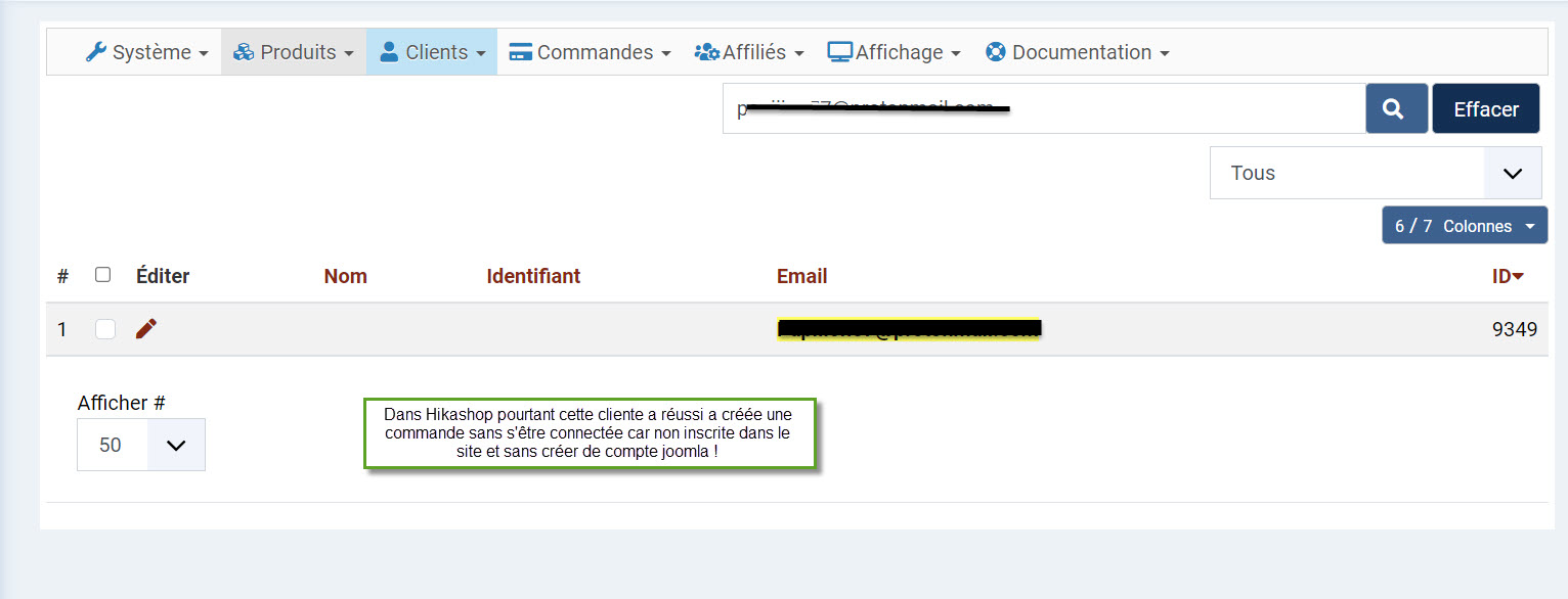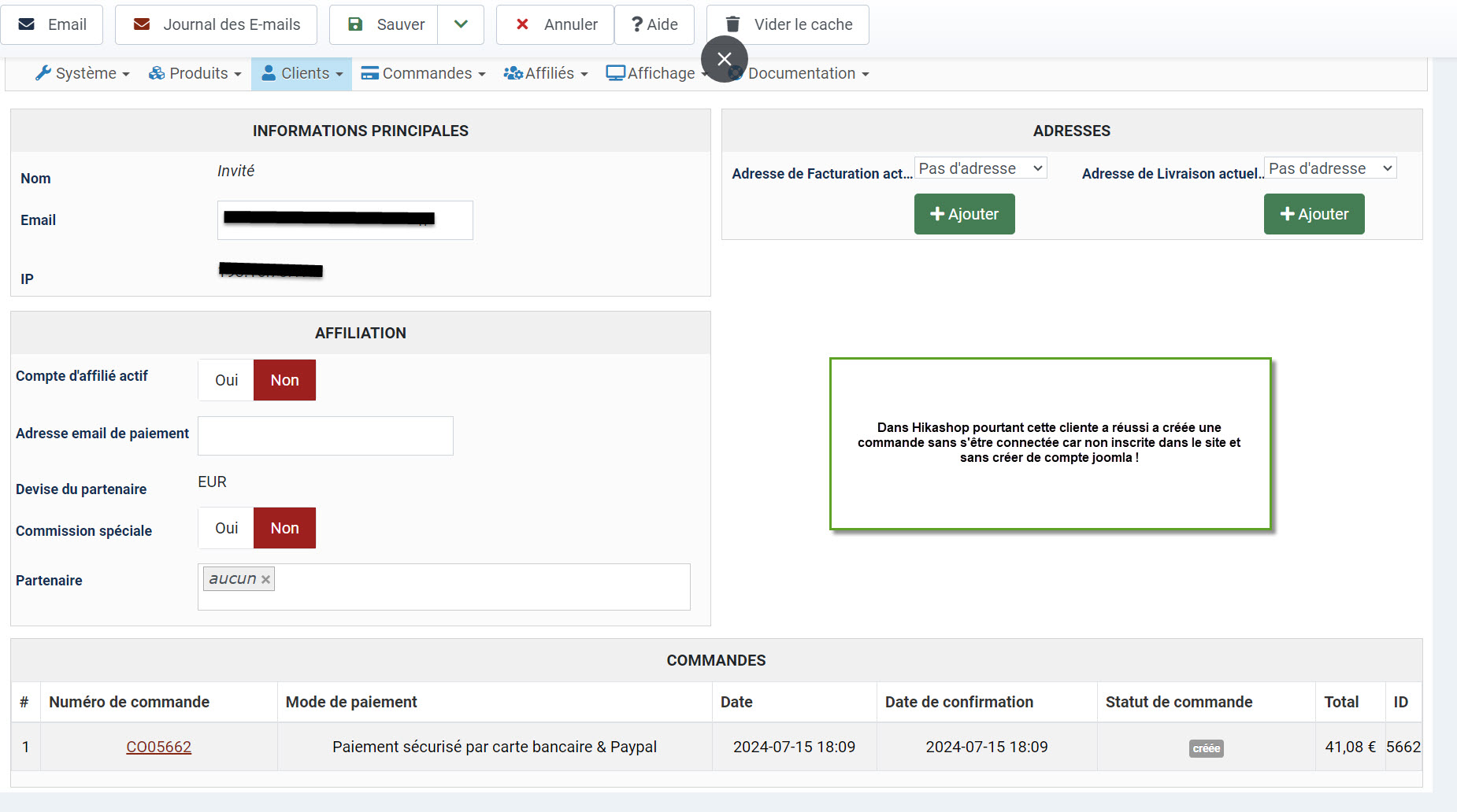 - le compte utilisateur a été supprimé. Or lorsqu'un compte utilisateur est supprimé alors que le compte est lié à une ou plusieurs commandes, l'entrée de l'utilisateur n'est pas supprimé d'HikaShop et HikaShop ne supprime pas les commandes associées. Car normalement, vous voulez garder les commandes au regard de la loi, en cas de contrôle.
