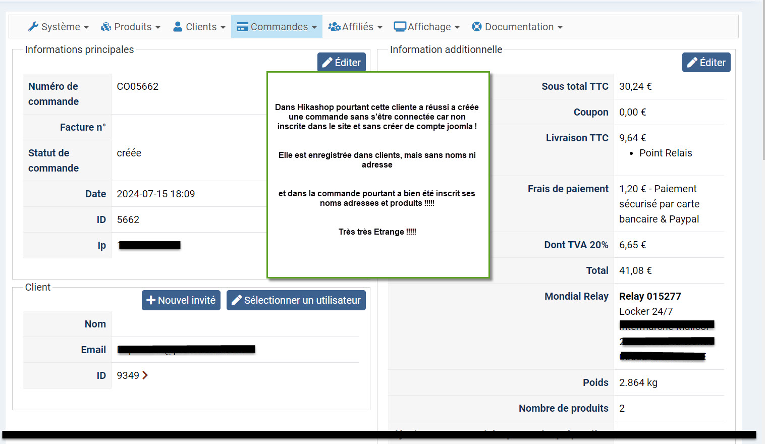 Donc la seule possibilité, c'est que la personne soit bien passé par le passage en caisse d'HikaShop pour créer la commande.
