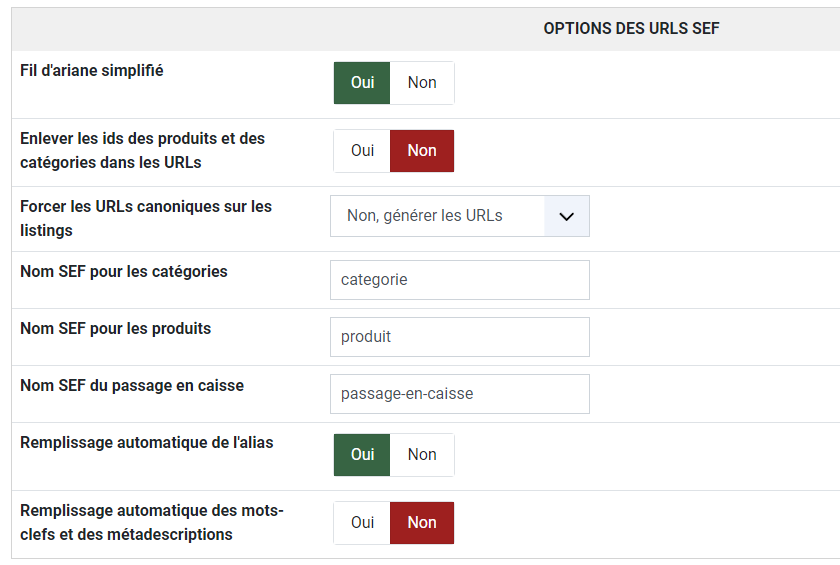 J'ai mis checkout dans mes explications pour simplifier mais voici comment sont réglés les paramètres SEO hikashop :