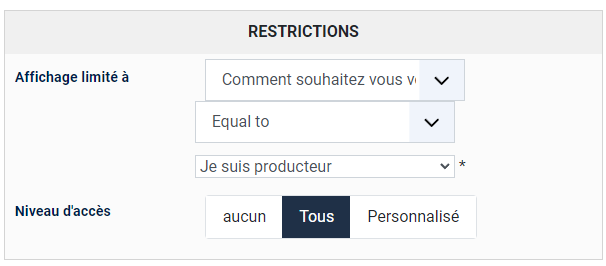 En fait, lorsque je change les réglage, rien ne change dans le front, par exemple, la question "quel type de livraison souhaitez vous" est réservée au producteurs, donc le champ est réglé comme ceci sur la question "comment souhaitez vous vous inscrire" :
