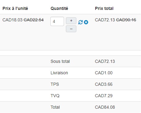 Le total pour une quantité de 4 = 18,03 * 4 = 72,12