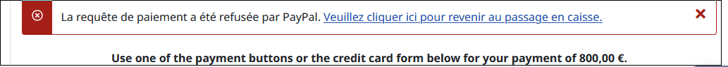 "La requête de paiement a été refusée par PayPal. Veuillez cliquer ici pour revenir au passage en caisse."