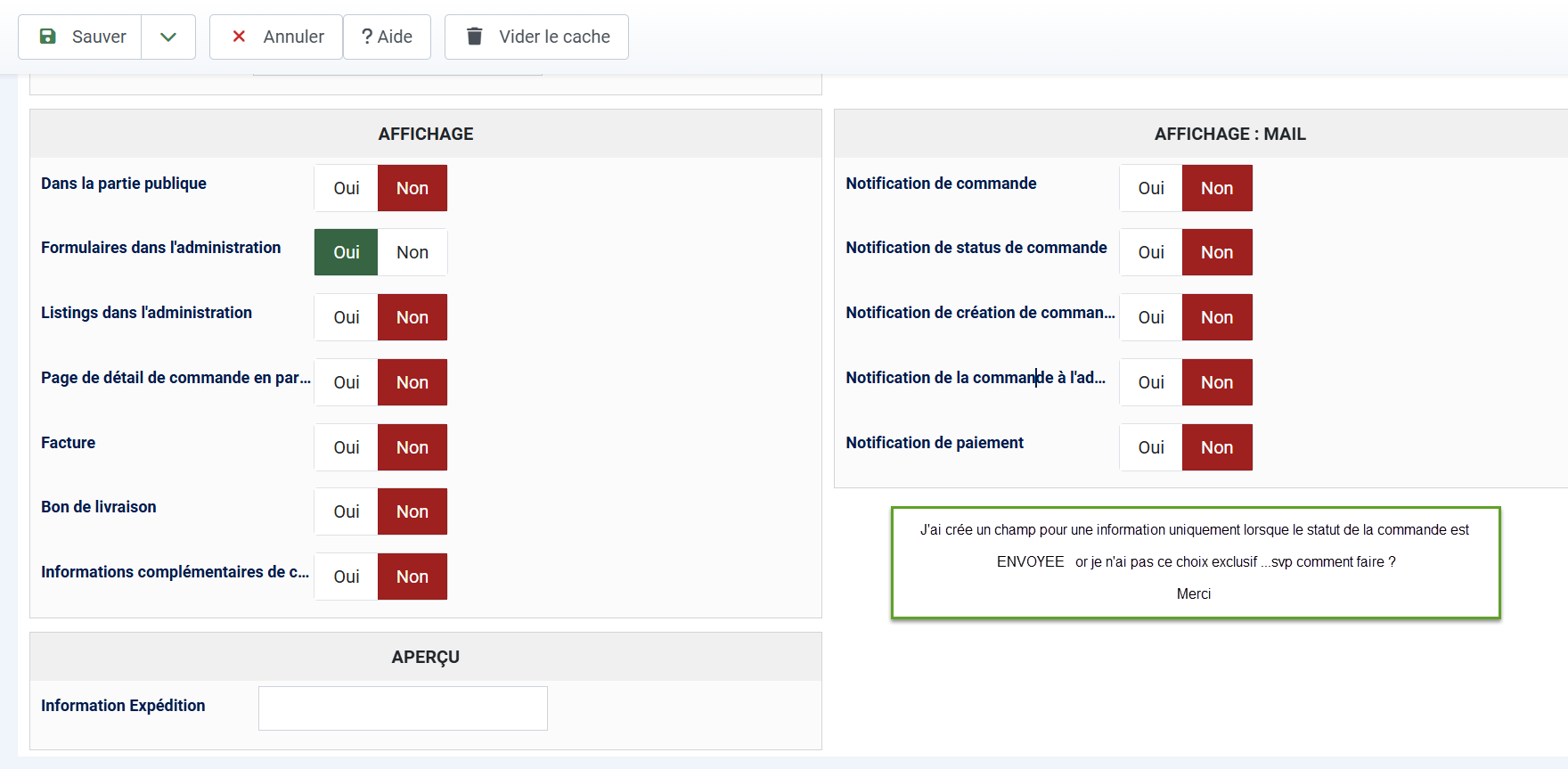 Je ne pense pas qu'il soit judicieux de passer par un champ personnalisé pour afficher un message dans l'email à destination du client.