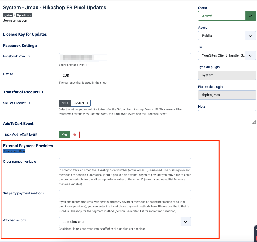 Pour finir j'ai acheté le plugin pour Meta Pixel, pouvez-vous me dire si les derniers champs (External Payment ProvidersExperience) concernant le paiement sont à compléter? Étant des options en version beta je me pose des questions...