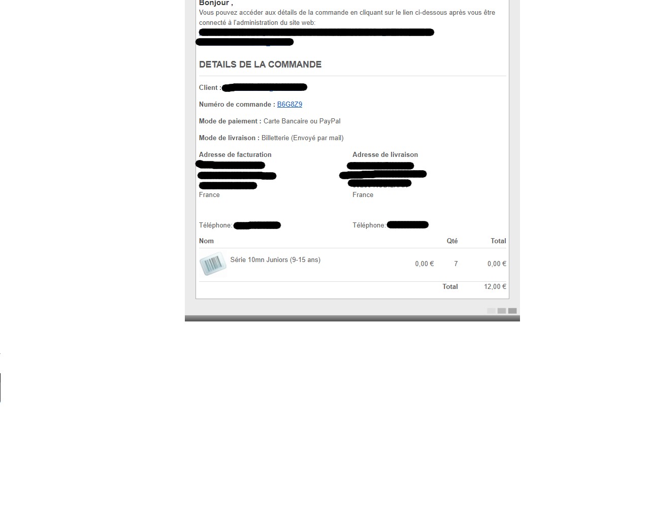 La commande avec les Serial en pièces jointes a bien été envoyée au client MAIS en tant qu'administrateur je n'ai pas été notifié par mail et je n'ai PAS reçu le fait que la commande soit confirmée avec les Serials..