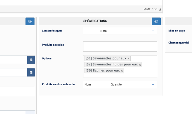 - Les confections cadeau, qui appartiennent à une autre catégorie (celle-ci publiée), intègrent les produits dans les options du produit même.