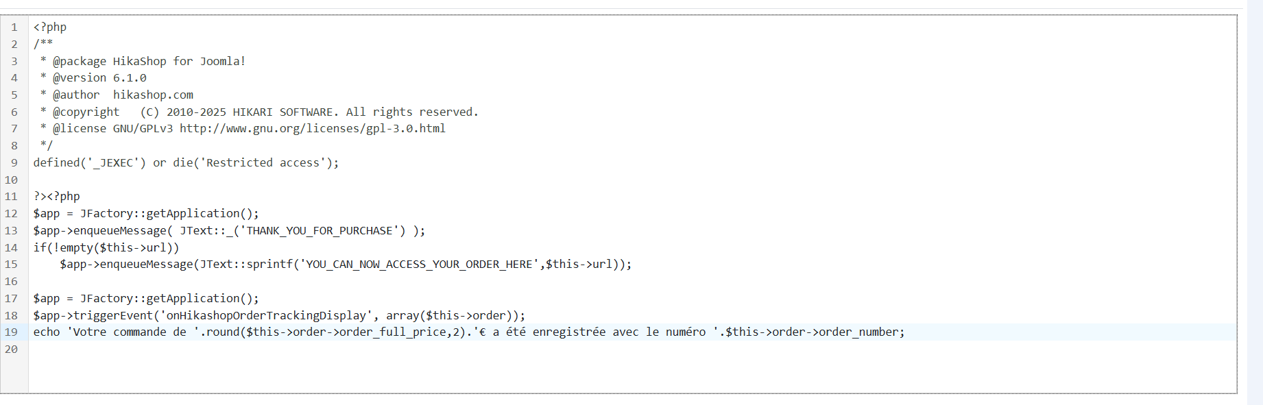 Enfin, je parle ici de la page de remerciement générique d'HikaShop. Mais certaines méthodes de paiement peuvent potentiellement avoir leur propre page de remerciement. Et en plus, toutes les méthodes de paiement ont normalement une option "URL de retour" qui permet de diriger l'utilisateur vers une autre page du site pour la page de remerciement (par exemple un article Joomla). Dans ce cas, il n'est pas possible de rajouter ces informations dynamiques à la page de remerciement. Il faudrait dans ces cas-là passer sur la page de remerciement générique d'HikaShop.
