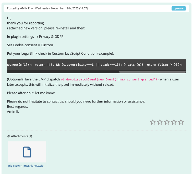 Dans l'attente d'une solution intégrée à votre plugin (à l'image du plugin Meta Pixel de Joomlamax) j'ai essayé de l'adapter pour le faire fonctionner avec le consentement de LegalBlink, ...cela n'a pas été chose simple, n'étant pas développeur je me suis fait aider par l'IA