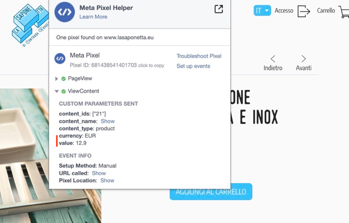 Avec le Meta Pixel Helper, je vois que les paramètres "Currency" et "Value" ne sont pas transmis. Cela arrive parce que le prix du produit principal est à 0,00€ et que le plugin semble lire cette valeur ignorant le prix des options sélectionnées par défaut.