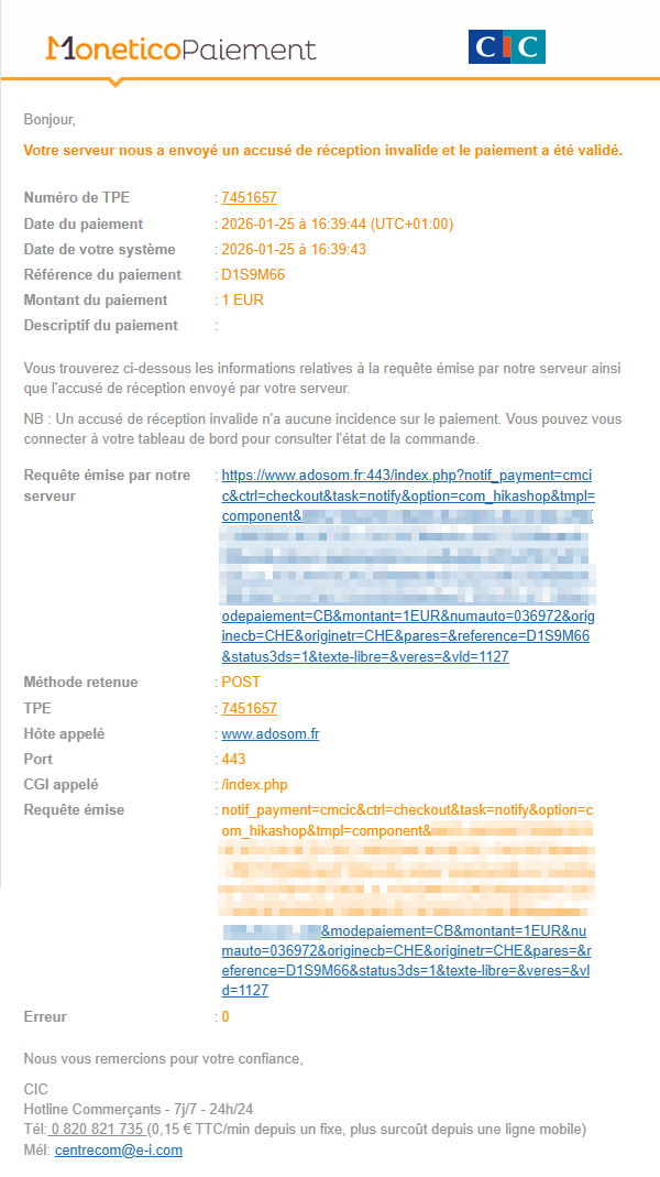 - Avec le 1er, celui qui fonctionnait sur Joomla 3.5 et qui nécessite de sélectionner le groupe bancaire, CIC dans mon cas, j'ai le même problème, la banque ne communique visiblement pas avec Hikashop qui n'indique pas le statut "Payé" mais "Annulé", et dans la colonne "Interface Retour" de la console Monetico il y a toujours l'indication "Erreur"