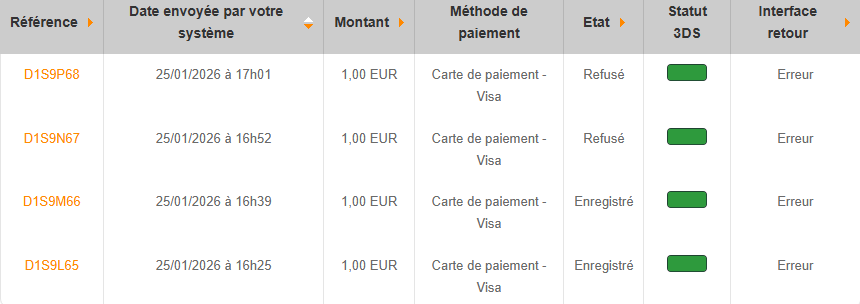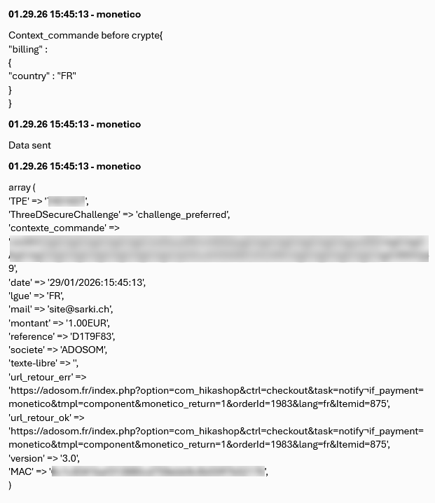 Toujours dans la console Monetico, je vois que pour une commande client, dans la colonne "Etat" il y a la mention "Carte non saisie", et que dans la colonne "Interface Retour" il est cette fois indiqué "OK". Dans Hikashop c'est indiqué comme un paiement "Annulé", ce qui ne permet pas de savoir si cette fois la communication avec la banque s'est faite puisque c'est pareil pour les paiements réussis, dans les logs il n'y avait que l'indication du problème d'adresse mail invalide, qui maintenant que c'est corrigé n'est plus indiqué.
