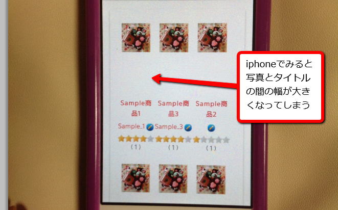 iPhoneで商品リストページを見ると添付写真のように写真とタイトルの間の幅が大きくなってしまいます。