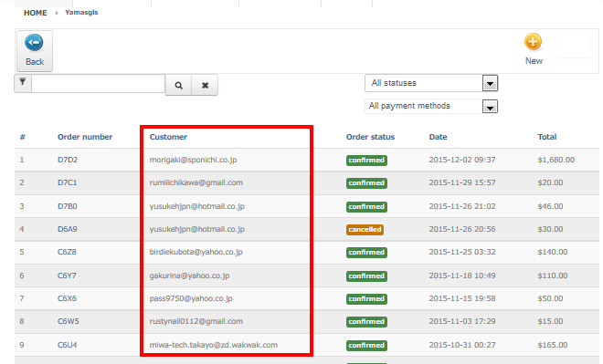 HikamarketのOrder ListのCustomerにユーザー名(メールアドレスを使用)が表示されています。