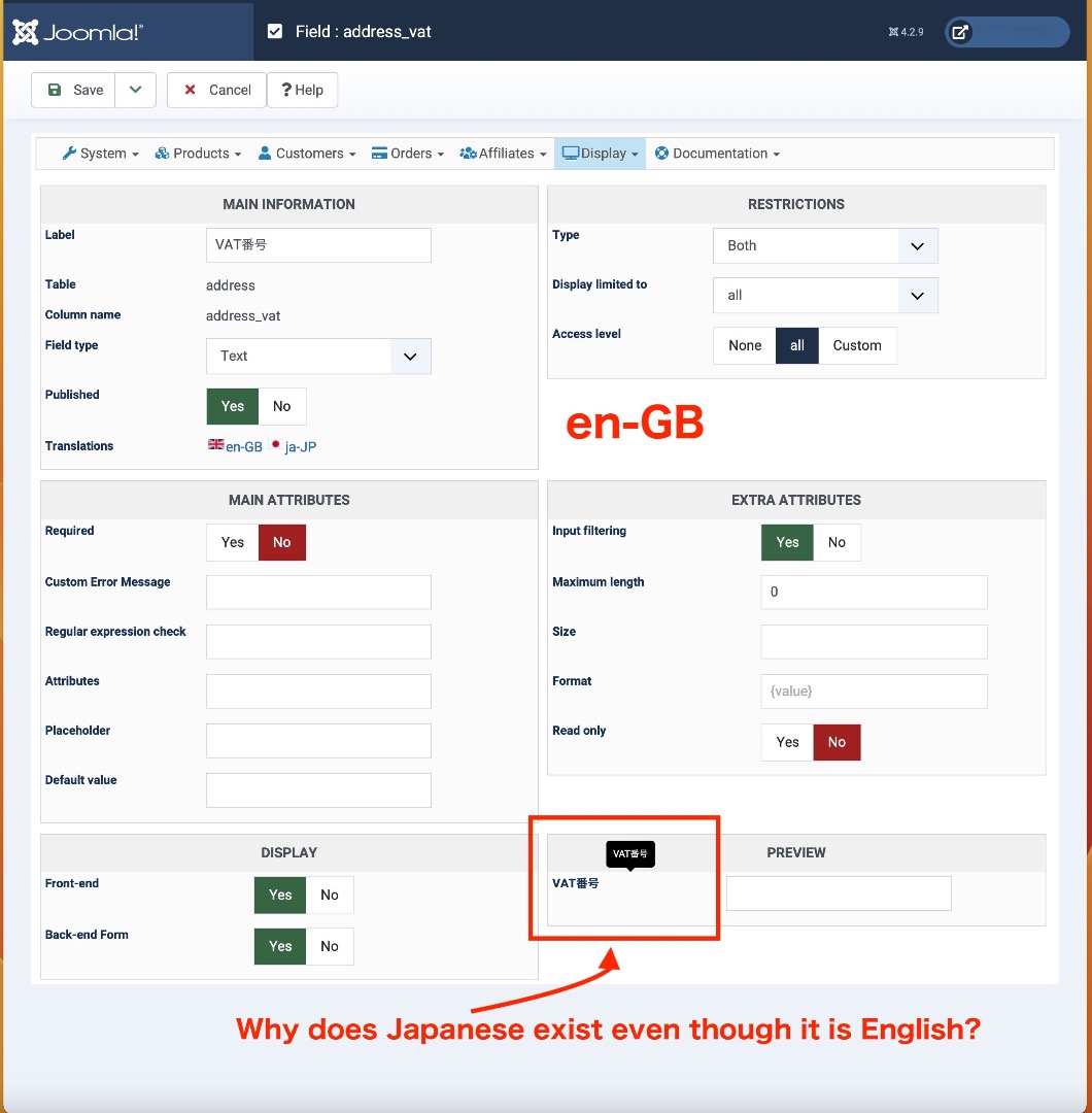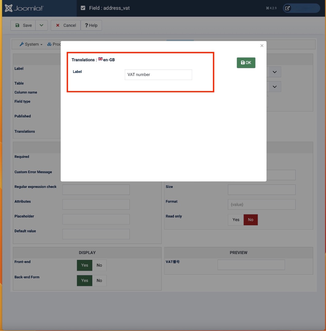 Then, in the label of the custom field address_VAT you should leave it to "VAT number" and then translate it in Japanese. It seems you've double translated the field label or something.