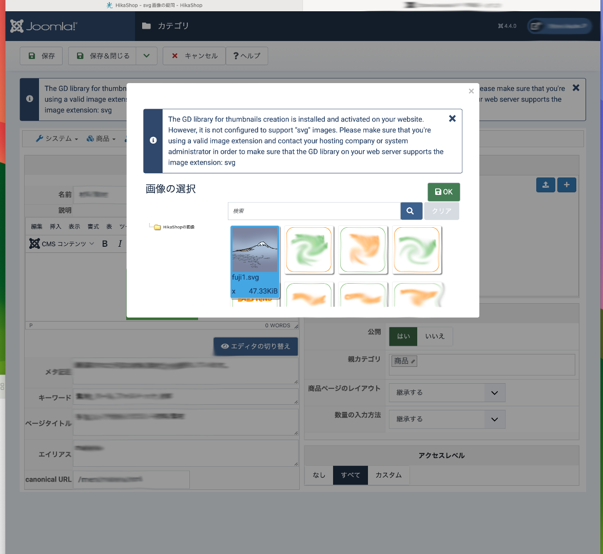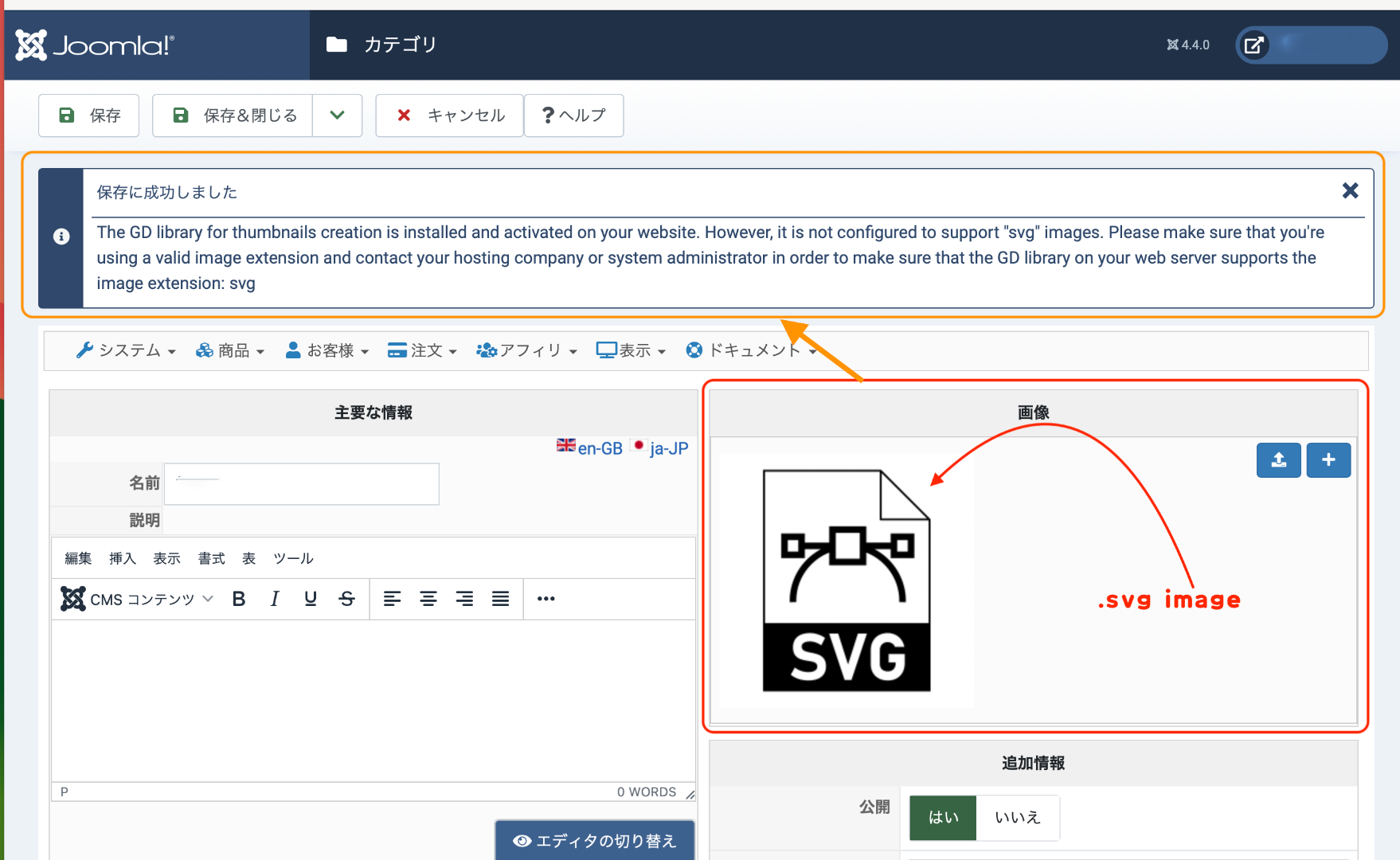 商品カテゴリにsvg画像を追加して保存すると、以下の表示文がでます。