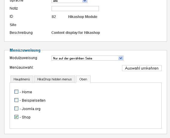 In der Menüzuweisung wird das Modul nur angezeigt wenn ich es wie auf dem Bild zu sehen im Hauptmenü verlinkt "Oben" Aktiviere.