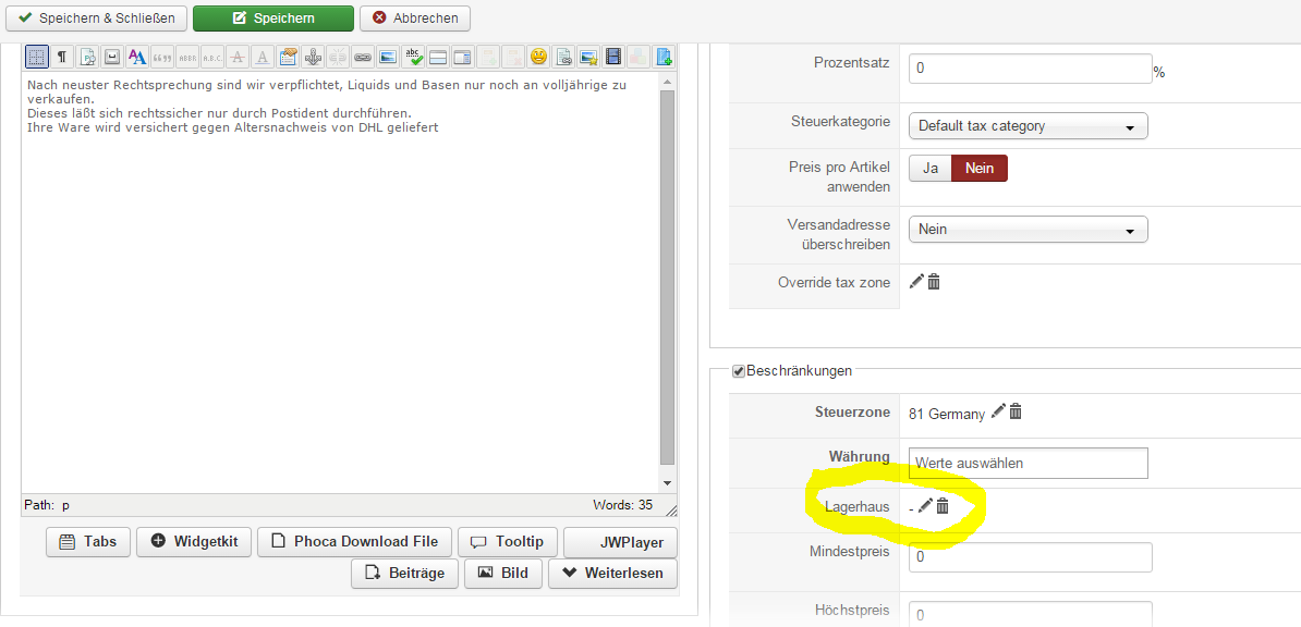 2.) Editiere deine Produkte und wähle jeweils das entsprechende Lagerhaus aus.