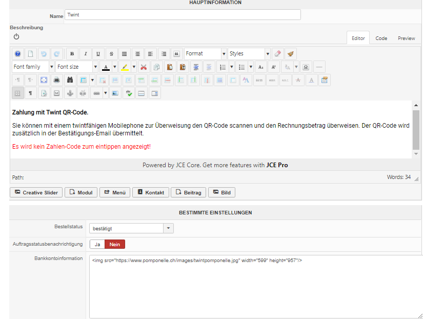 Wenn du jetzt die Rechnung so konfiguriert hast, das sie default-mäßig bei "confirmed" generiert wird (und nicht bei "created"), dann taucht der Inhalt von "Bankkontoinformation" auch nicht in der Rechnung auf, heißt also auch, dass es mit der Rechnung keine Schwierigkeiten geben dürfte.
