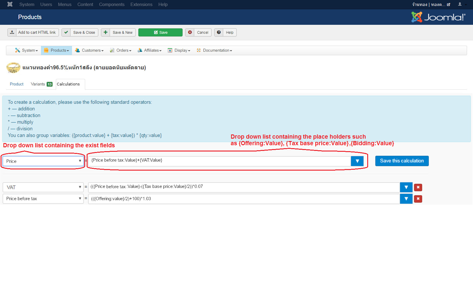 Step 3 Click on Calculation tab (This calculation tab is supposed to be shown up after clicking OK button at step 2). Click the drop down on the left of equal symbol to pick up an exist field or write the new one such as “Price before tax” and write calculation formula on the right of equal symbol. And then click “Save this calculation” button. Start over calculation formula writing process for